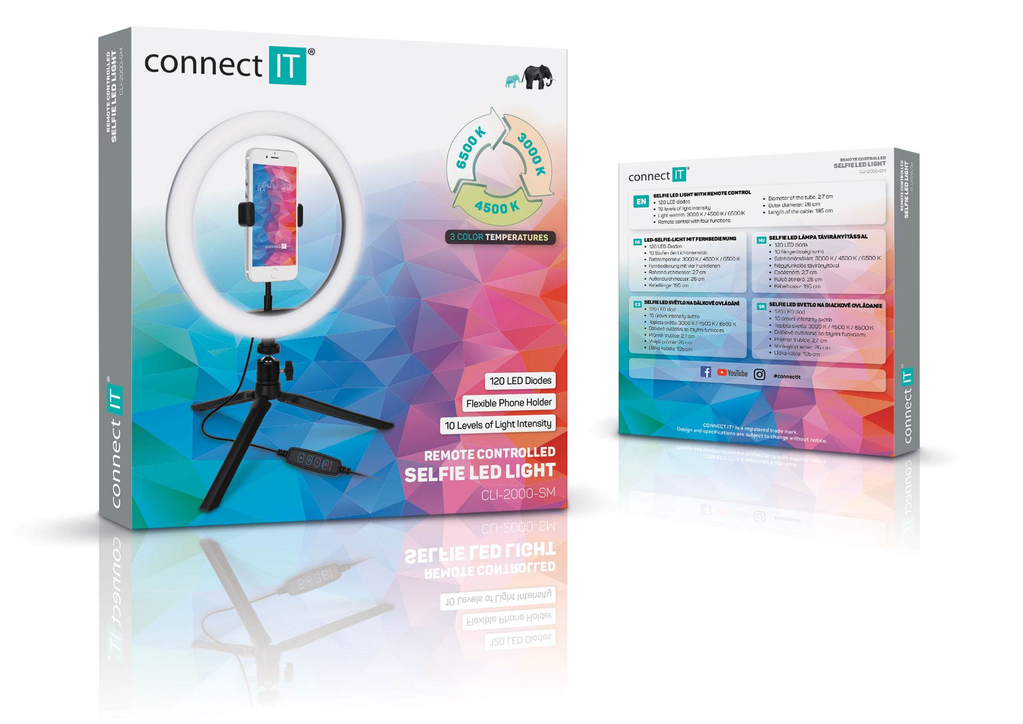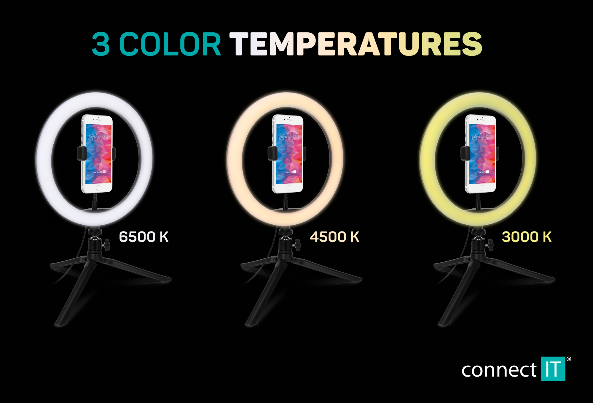 Kruhové selfie LED světlo "Selfie10Ring" s flexibilním držákem na mobilní telefon, stativem s kulovou hlavou a dálkovým ovládáním pro domácí i profesionální použití umožňuje nastavit barevnou teplotu světla na 3 různé úrovně (3000/4500/6500 K).