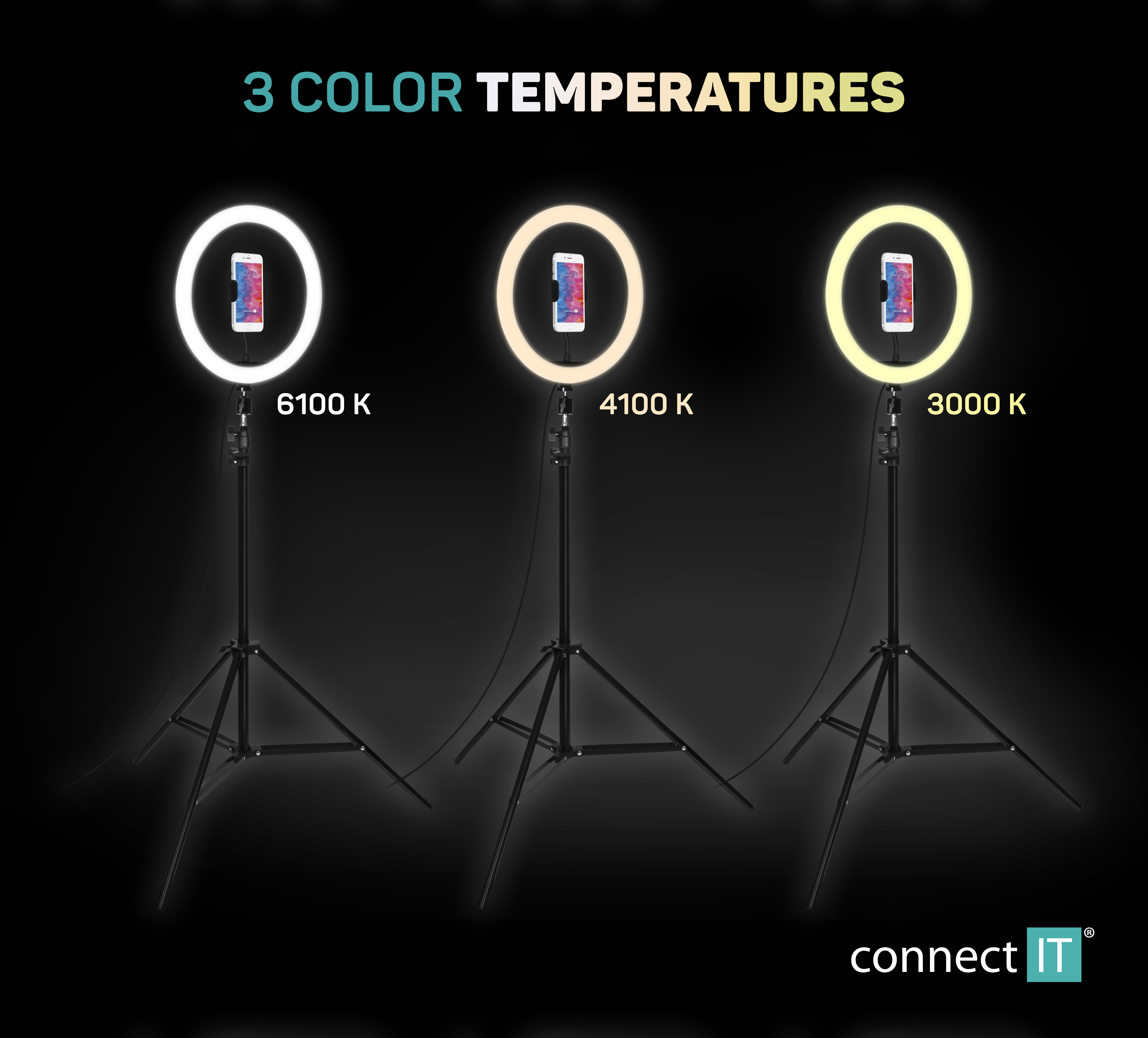 Kruhové selfie LED světlo "Selfie12Ring" s flexibilním držákem na mobilní telefon, stativem s maximální výškou 210 cm, kulovou hlavou a dálkovým ovládáním pro domácí i profesionální použití umožňuje nastavit barevnou teplotu světla na 3 různé úrovně (3000/4100/6100 K).