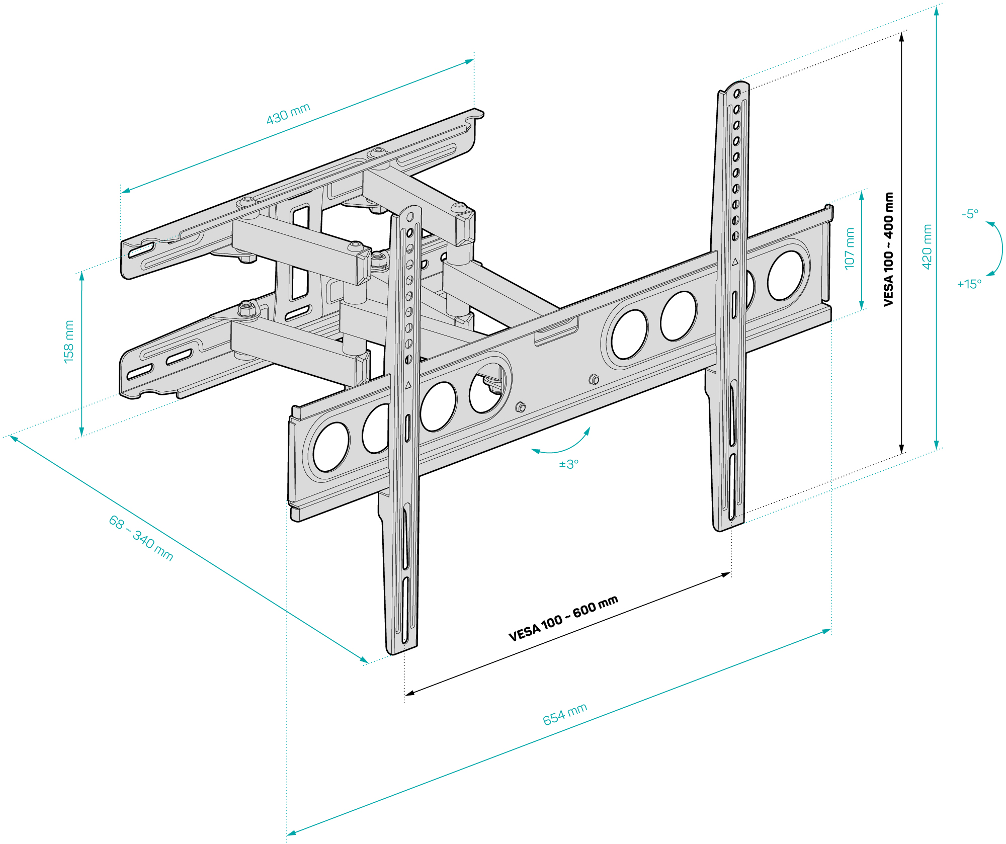 Rozměry držáku (š x v x h): 654 x 420 x 68~340 mm
