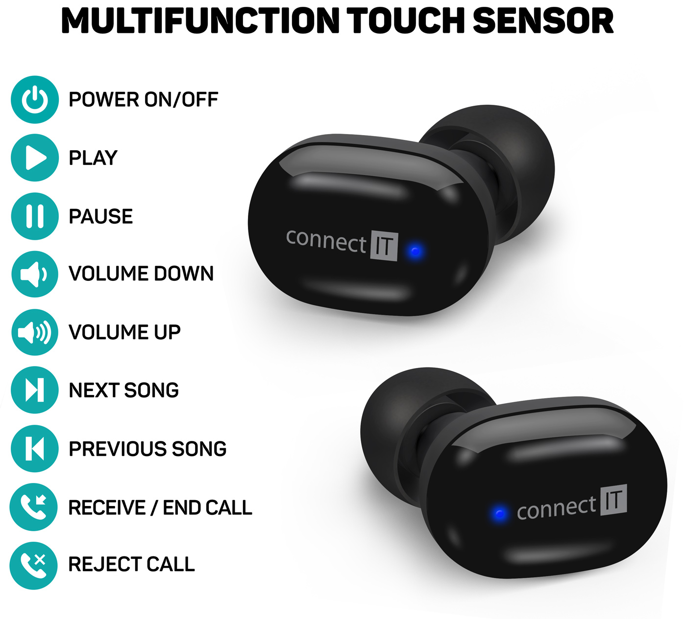 CONNECT IT True Wireless SensorTouch sluchátka do uší s mikrofonem, ČERNÁ