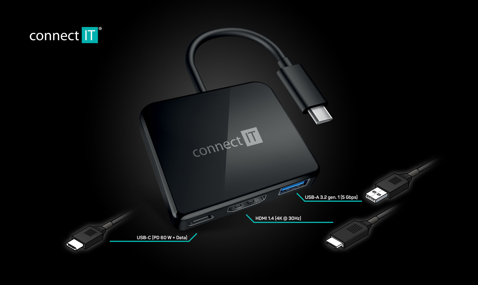 CONNECT IT USB-C hub, 3v1 (USB-C,USB-A,HDMI), externí, ČERNÝ