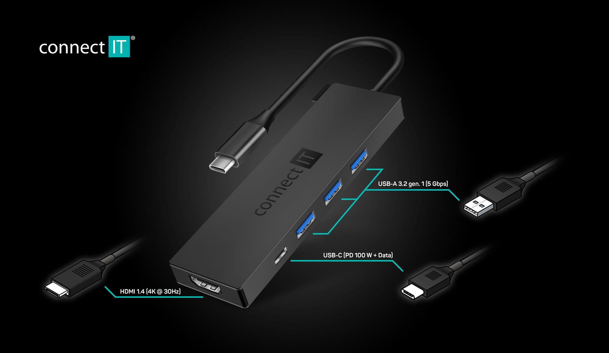 CONNECT IT USB-C hub, 5v1 (USB-C,3xUSB-A,HDMI), externí, ANTRACITOVÝ