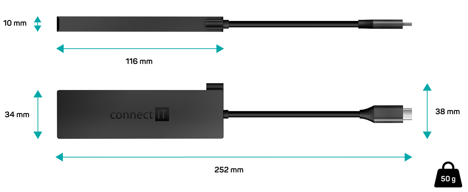 Rozměry bez kabelu (š × h × v): 116 x 34 x 10 mm