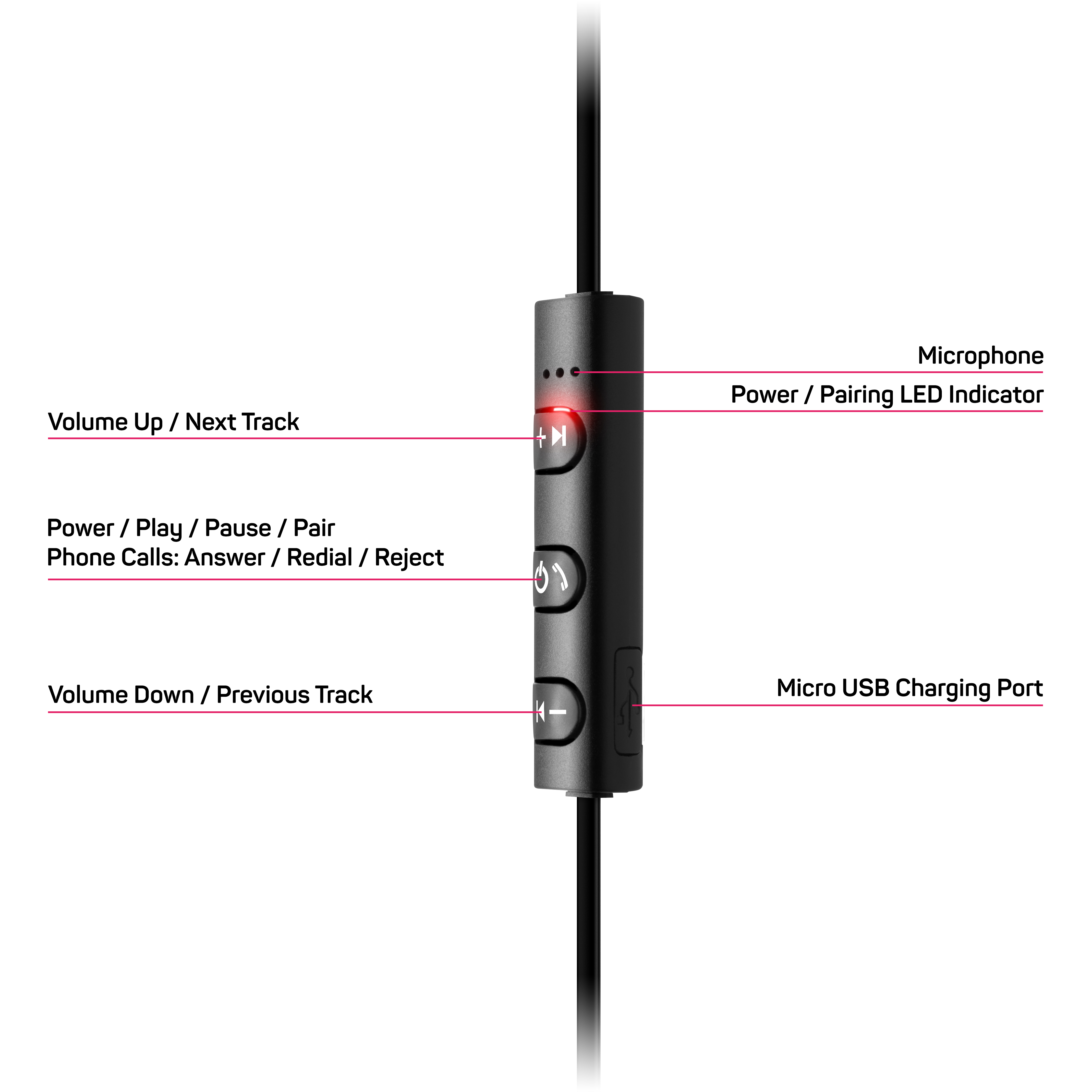 Bluetooth stereoheadset s integrovaným ovládáním hlasitosti, stop, přehrávání a přijímání a odmítání hovorů.