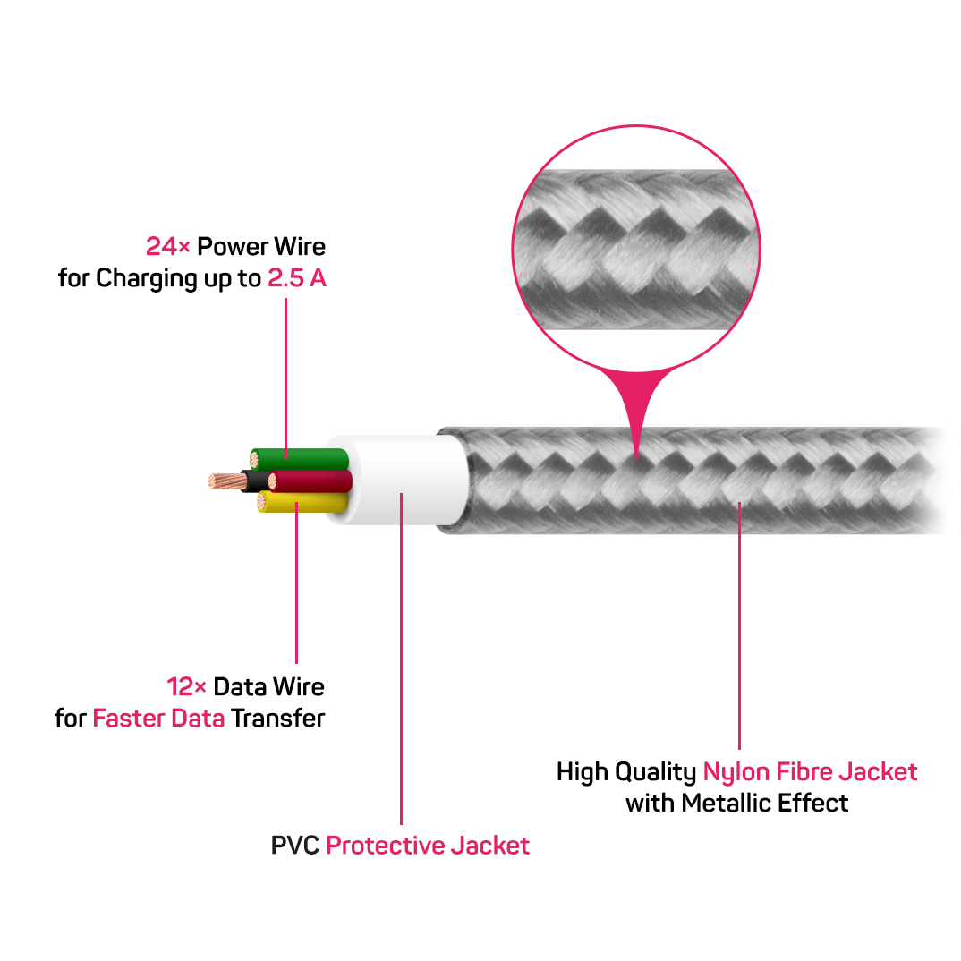 Speciální prémiový nylonový oplet s metalickým povrchovým efektem garantuje vysokou ohebnost a životnost