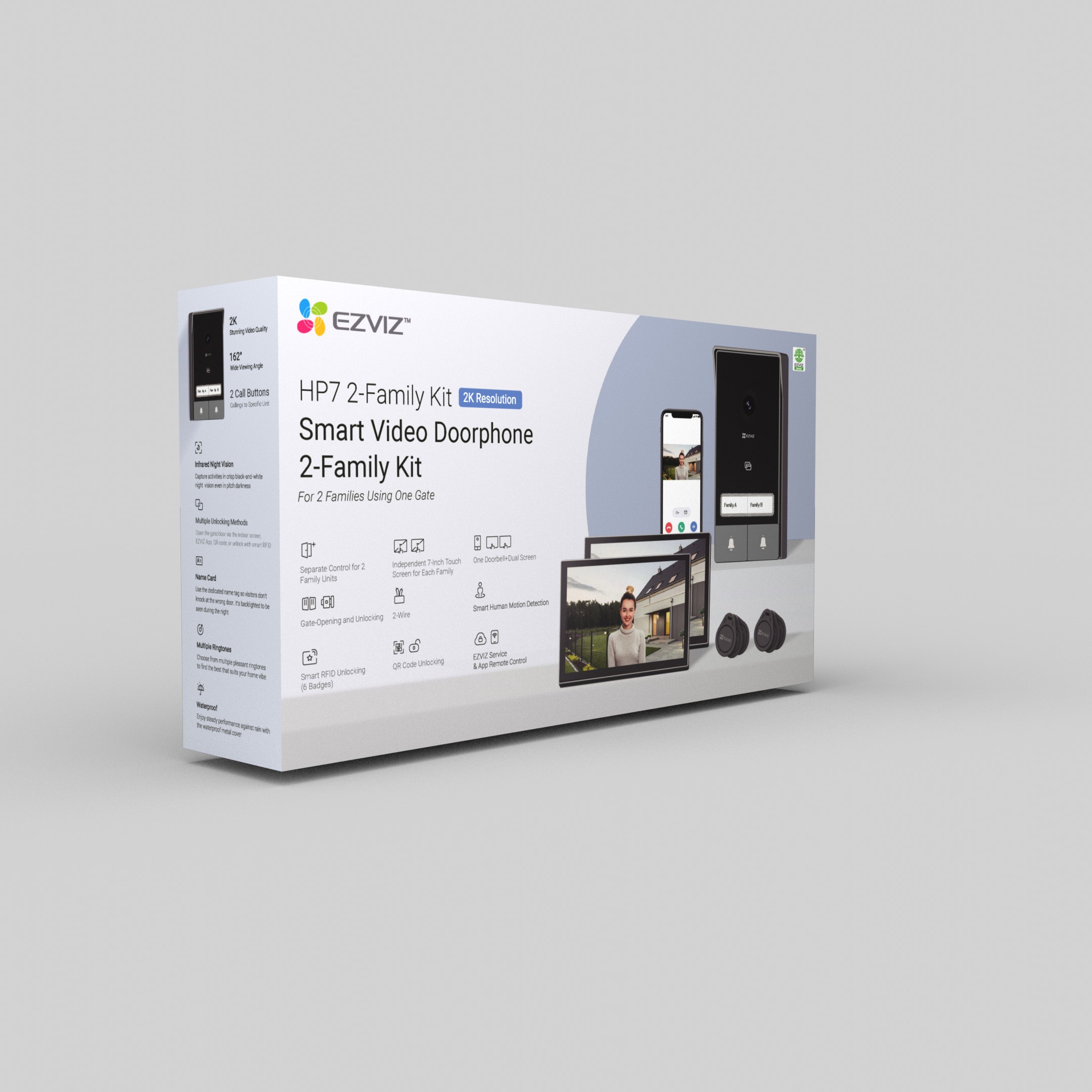 HP7 2-Family Kit je inteligentní vstupní systém určený pro dvě domácnosti sdílející jeden hlavní vchod. Nabízí samostatné 7" dotykové monitory pro každou rodinu, ovládání přes mobilní aplikaci, vzdálené odemykání a vysoké 2K rozlišení obrazu. Díky AI detekci lidské postavy, IR nočnímu vidění a odolnému provedení je ideální pro bezpečné a pohodlné ovládání vstupu do domu nebo vily. Systém podporuje microSD i cloudové úložiště a umožňuje personalizované zvonění i RFID odemykání.