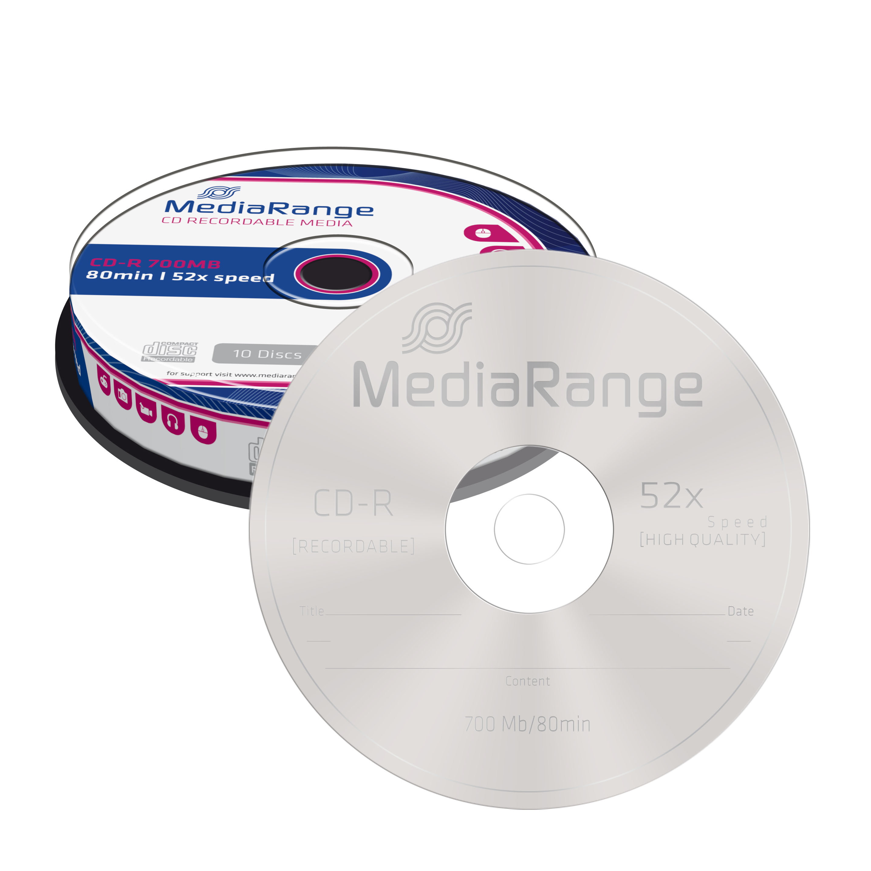 Kvalitní a cenově dostupná média CD-R značky MediaRange poskytují spolehlivý zápis dat s kapacitou až 700 MB při maximální rychlosti zápisu až 52x. Je to tedy ideální řešení běžného zálohování dat jako jsou zvukové záznamy, fotografie či další soubory. Média jsou balena po 10 kusech ve spindlu.