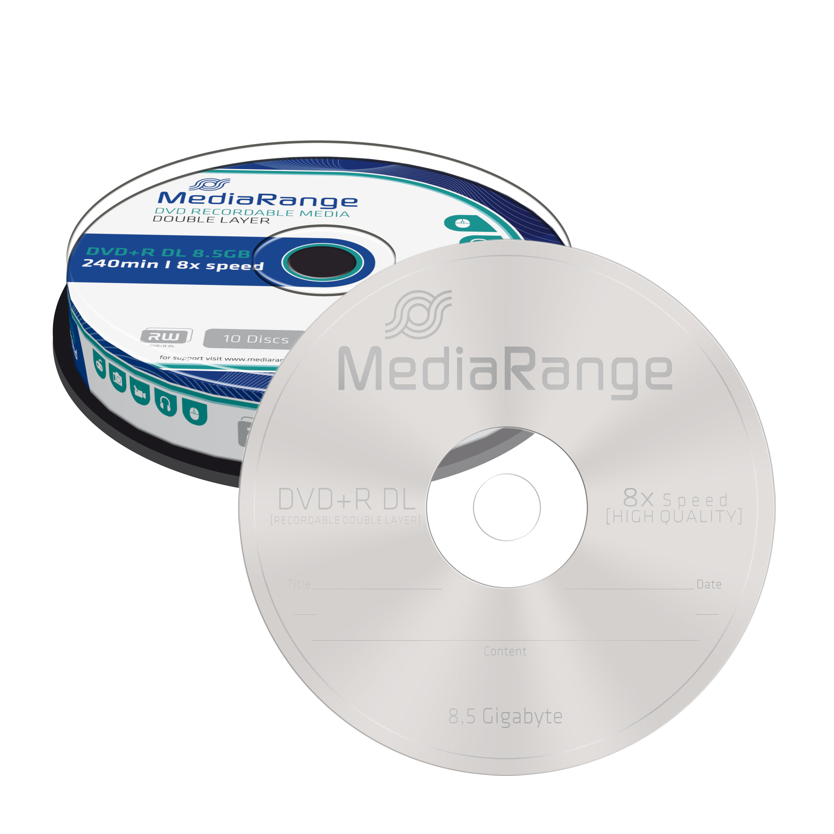 Kvalitní a cenově dostupná dvouvrstvá média DVD+R značky MediaRange. Poskytuje spolehlivý zápis dat s kapacitou až 8,5 GB při maximální rychlosti zápisu až 8x. Je to tedy ideální řešení zálohování velkého množství dat, (např. kvalitní digitální video, fotografie, zvukové záznamy či další soubory.) Média jsou balena po 10 kusech ve spindlu.