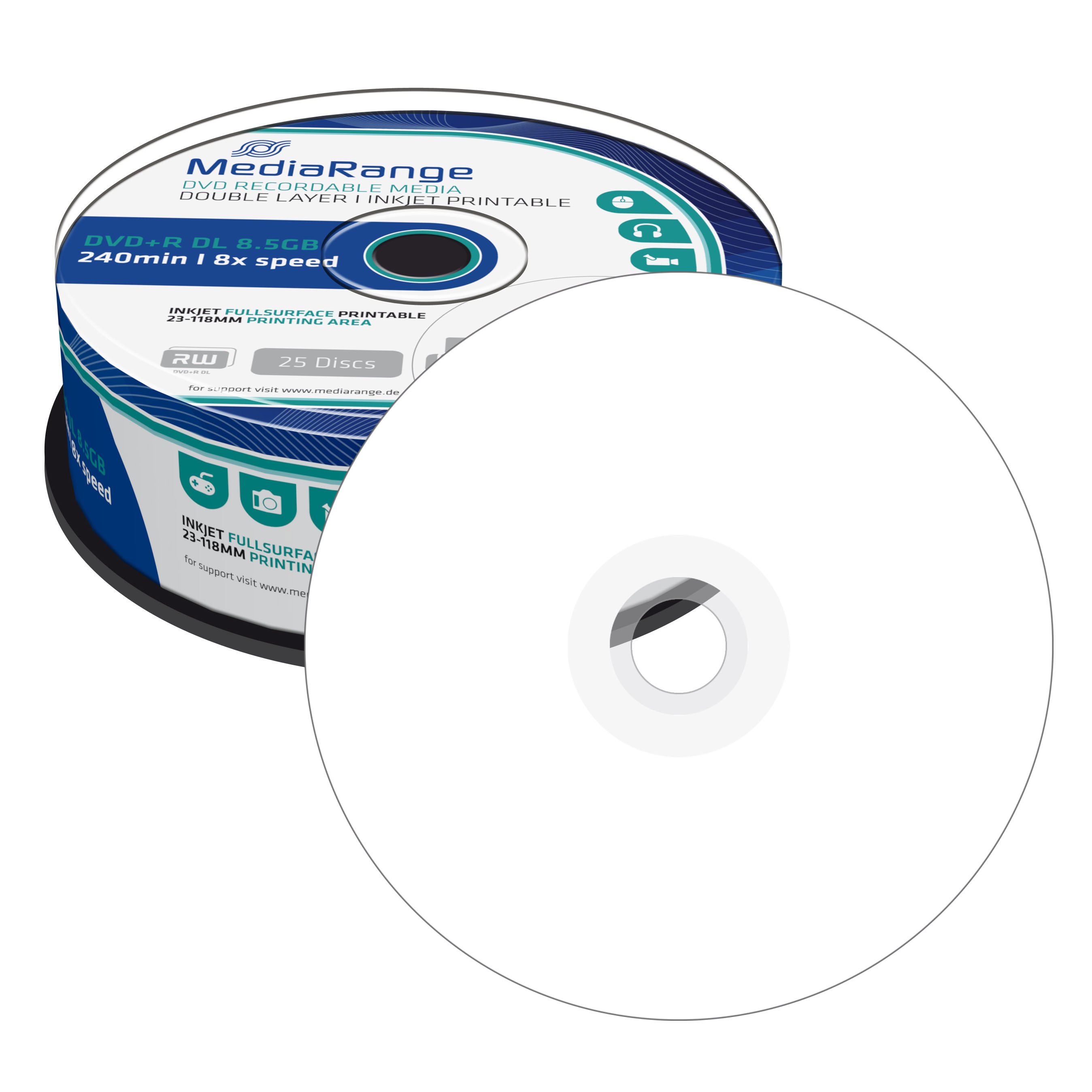 Kvalitní a cenově dostupná dvouvrstvá média DVD+R značky MediaRange. Bílý povrch k potištění na inkoustové tiskárně, poskytuje spolehlivý zápis dat s kapacitou dosahující až 8,5 GB při maximální rychlosti zápisu až 8x. Je to tedy ideální řešení zálohování velkého množství dat (např. kvalitní digitální video, fotografie, zvukové záznamy či další soubory.) Média jsou balena po 25 kusech ve spindlu.