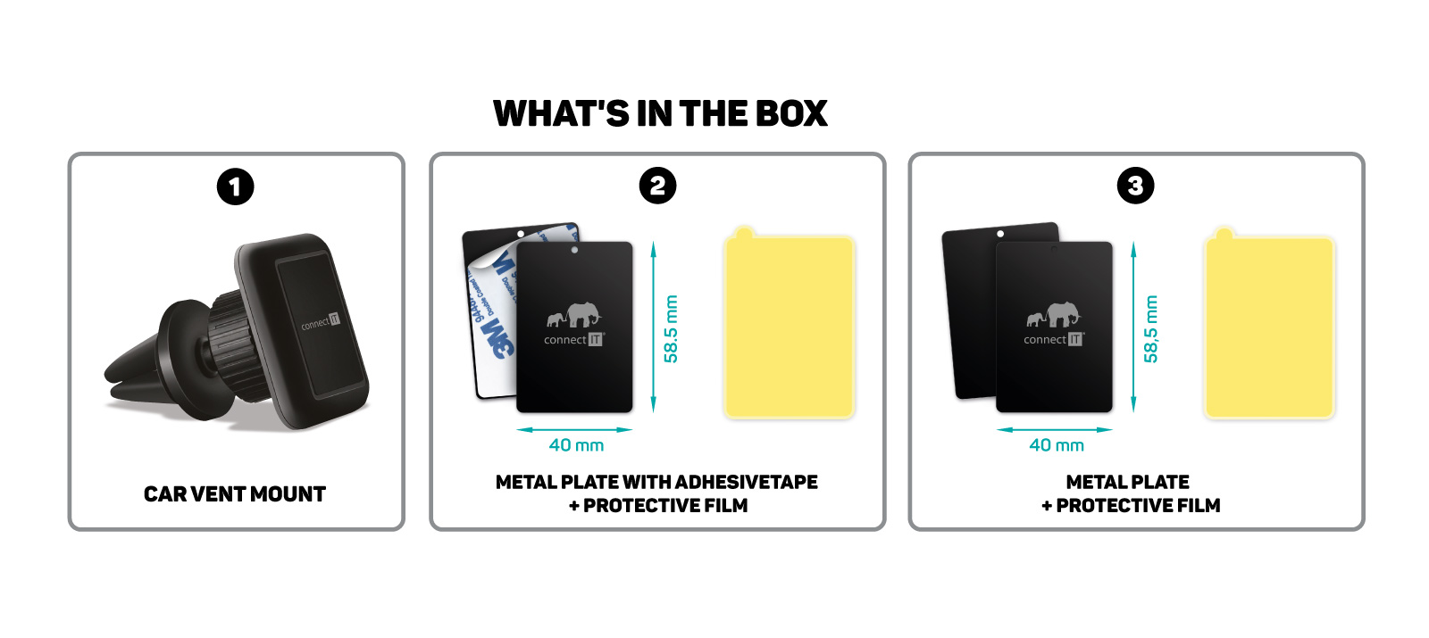 Unifikovaný rozměr kovových destiček 40 × 58,5 mm garantuje komfortní kontakt telefonu s magnetickým držákem a kompatibilitu se včemi telefony