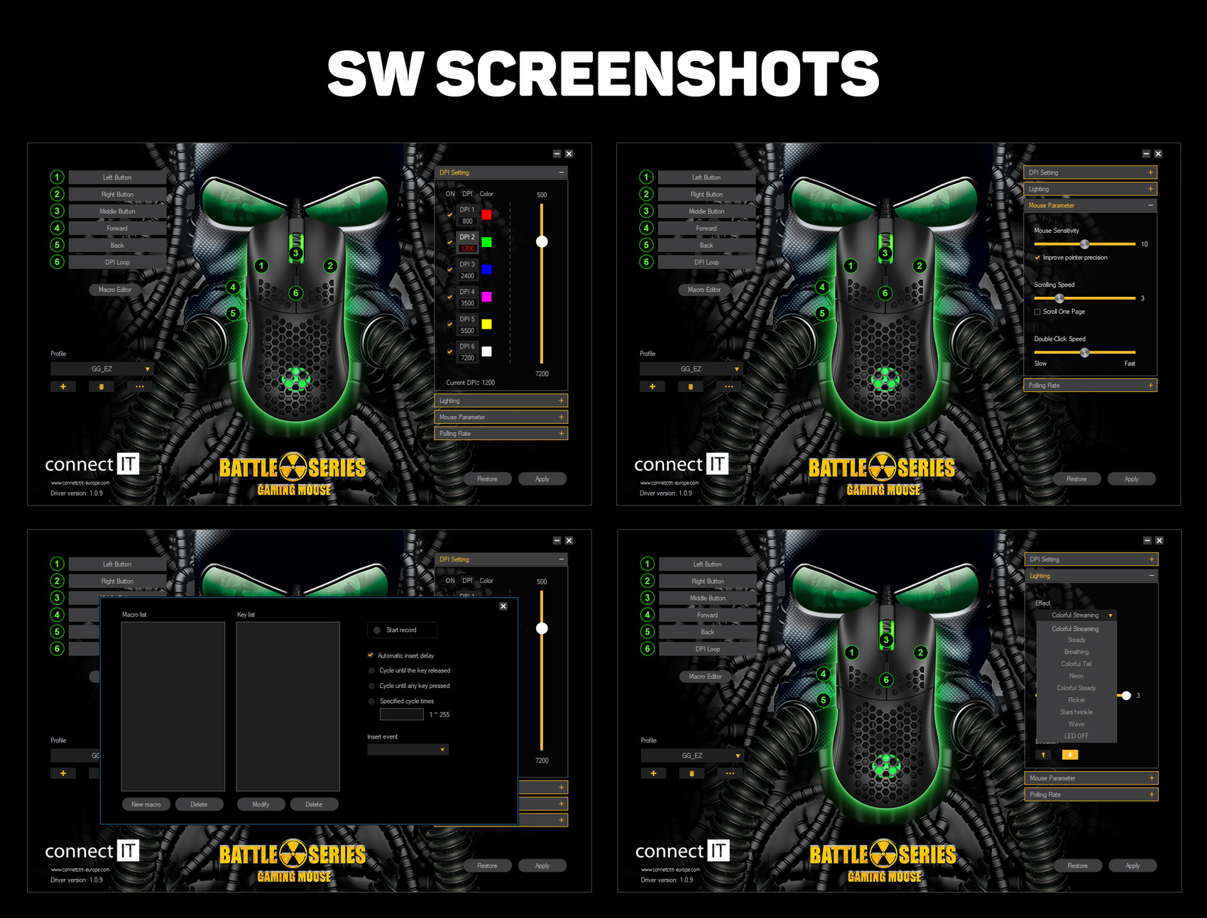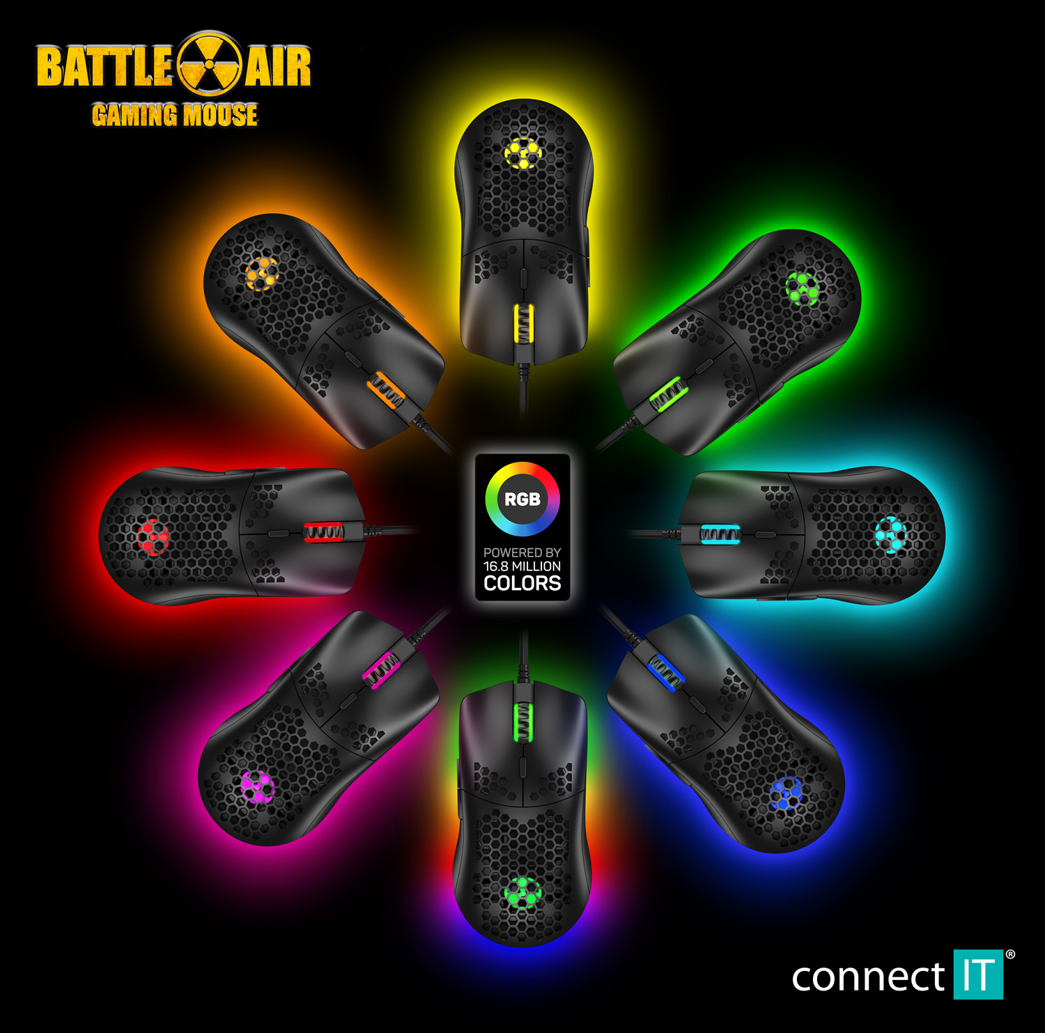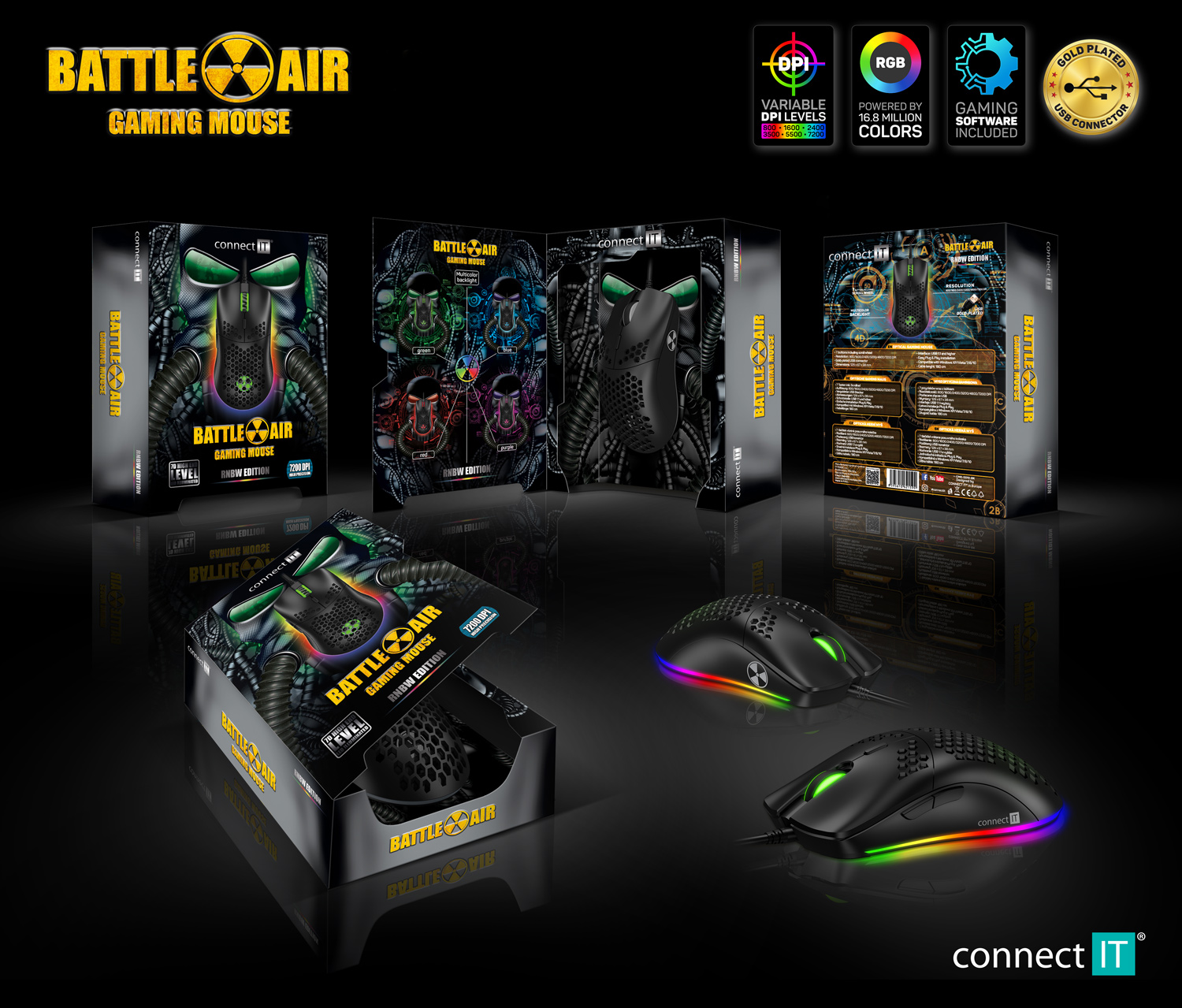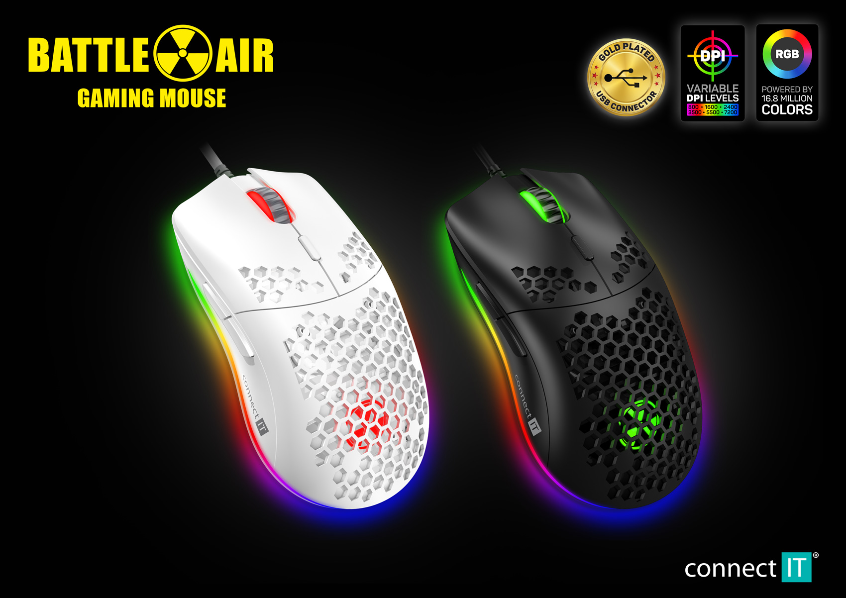 Kromě běžných funkcí je tato myš unikátní svojí odlehčenou konstrukcí. Díky perforaci těla myši a tlačítek speciálním hexagonovým tvarem, kterým došlo ke snížení váhy myši o 50%. Tento typ perforace zajistí maximální grip a stabilitu při dlouhodobém hraní. K této myši je dodáván software ke stažení zcela zdarma na stránkách www.connectit-europe.com. Samozřejmostí je u této série prémiový oplet přívodního kabelu a pozlacený USB konektor.