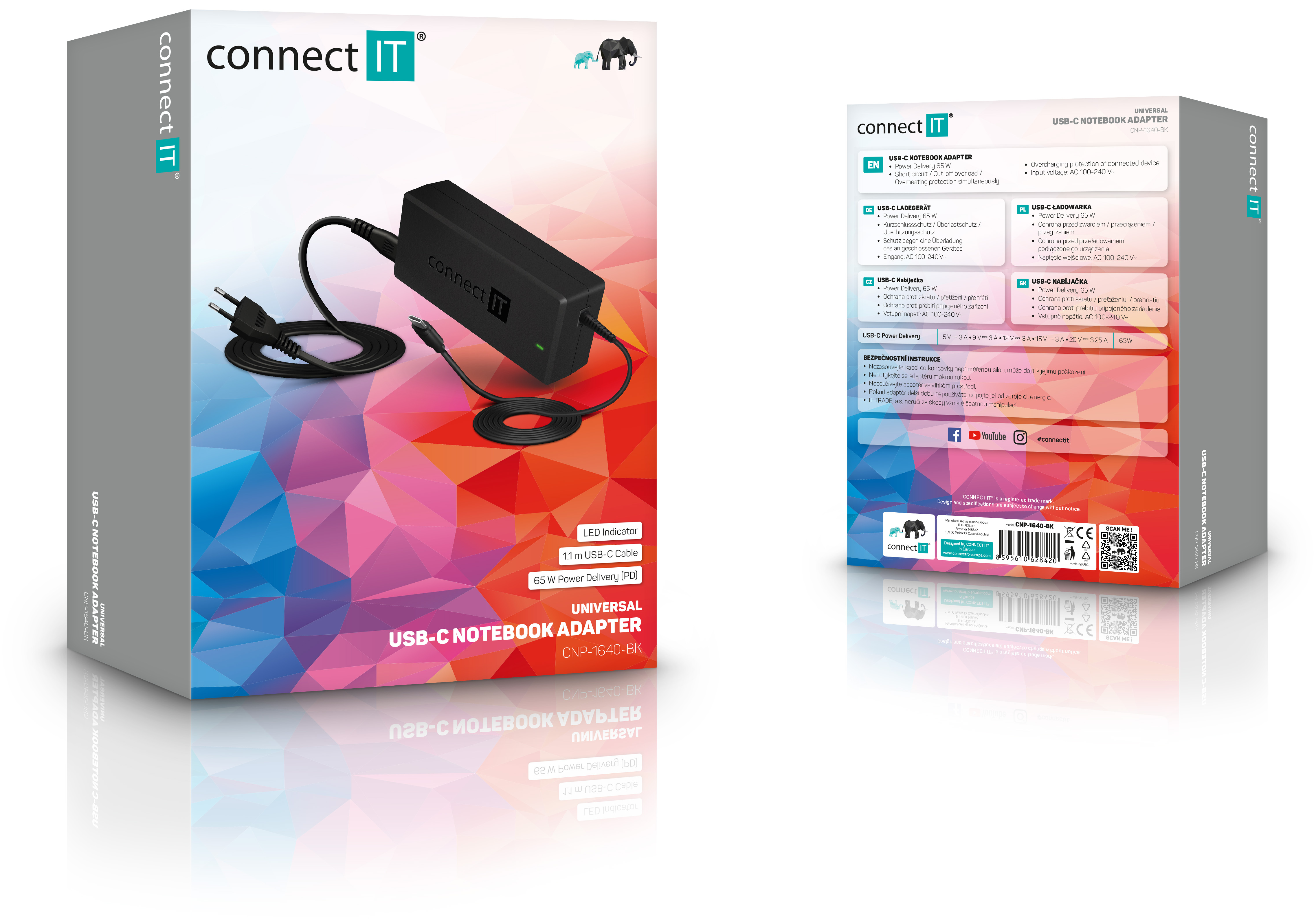 Univerzální notebookový adaptér 65 W s USB-C (Type C) konektorem pro notebooky značek Apple, Dell, Acer, Lenovo atd. Nabízí rychlé nabíjení a vysoký výkon. Je vybaven čtyřnásobnou 4SafeMax ochranou proti přepětí, zkratu, přetížení a přehřátí která brání poškození vašeho notebooku. Pružná antivibrační fixace vnitřní konstrukce a součástek eliminuje riziko poškození při pádu na zem. K cestování jej předurčuje i velký rozsah vstupního napětí už od 100 V, takže ji můžete v kombinaci s cestovním adaptérem použít i v zemích, kde je standardem nižší napětí (např. 120 V v USA).