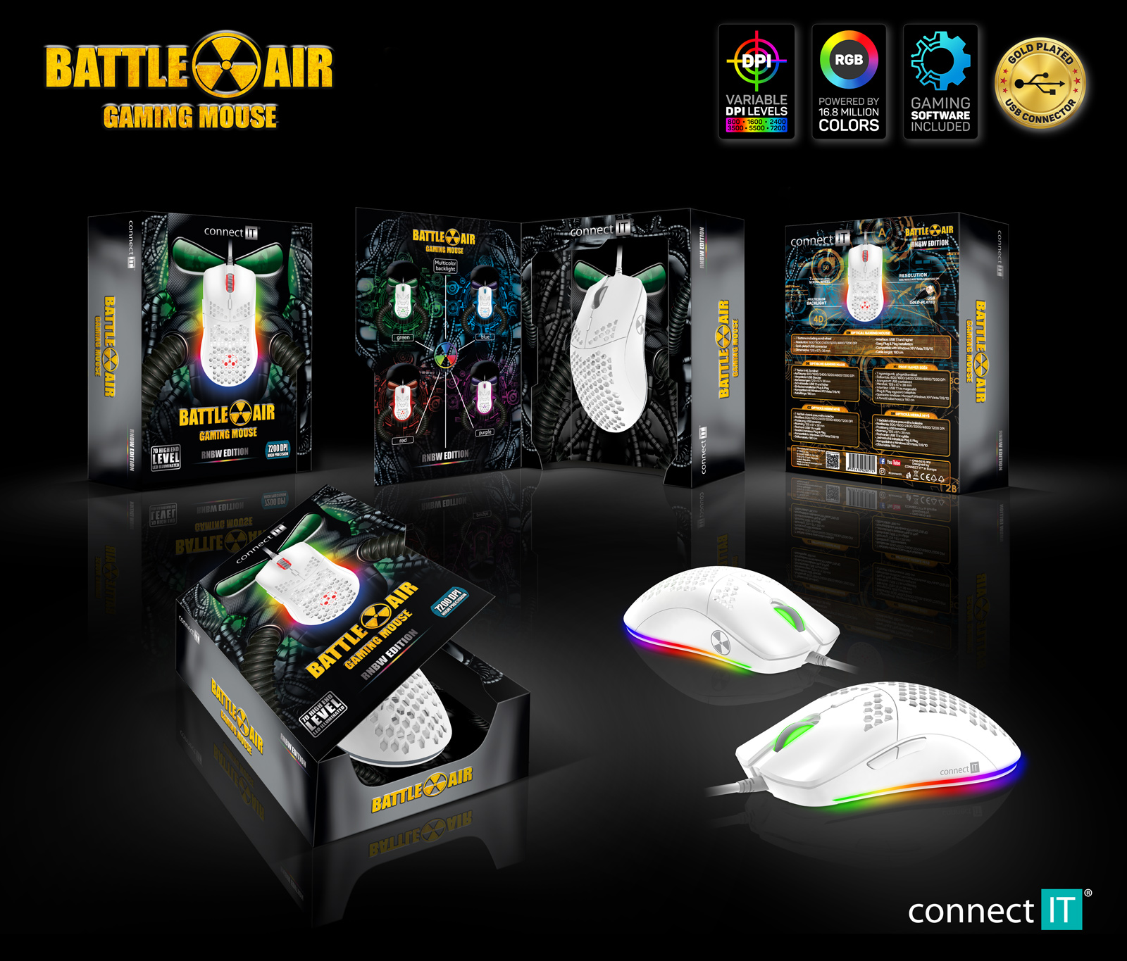 Kromě běžných funkcí je tato myš unikátní svojí odlehčenou konstrukcí. Díky perforaci těla myši a tlačítek speciálním hexagonovým tvarem, kterým došlo ke snížení váhy myši o 50%. Tento typ perforace zajistí maximální grip a stabilitu při dlouhodobém hraní. K této myši je dodáván software ke stažení zcela zdarma na stránkách www.connectit-europe.com. Samozřejmostí je u této série prémiový oplet přívodního kabelu a pozlacený USB konektor.