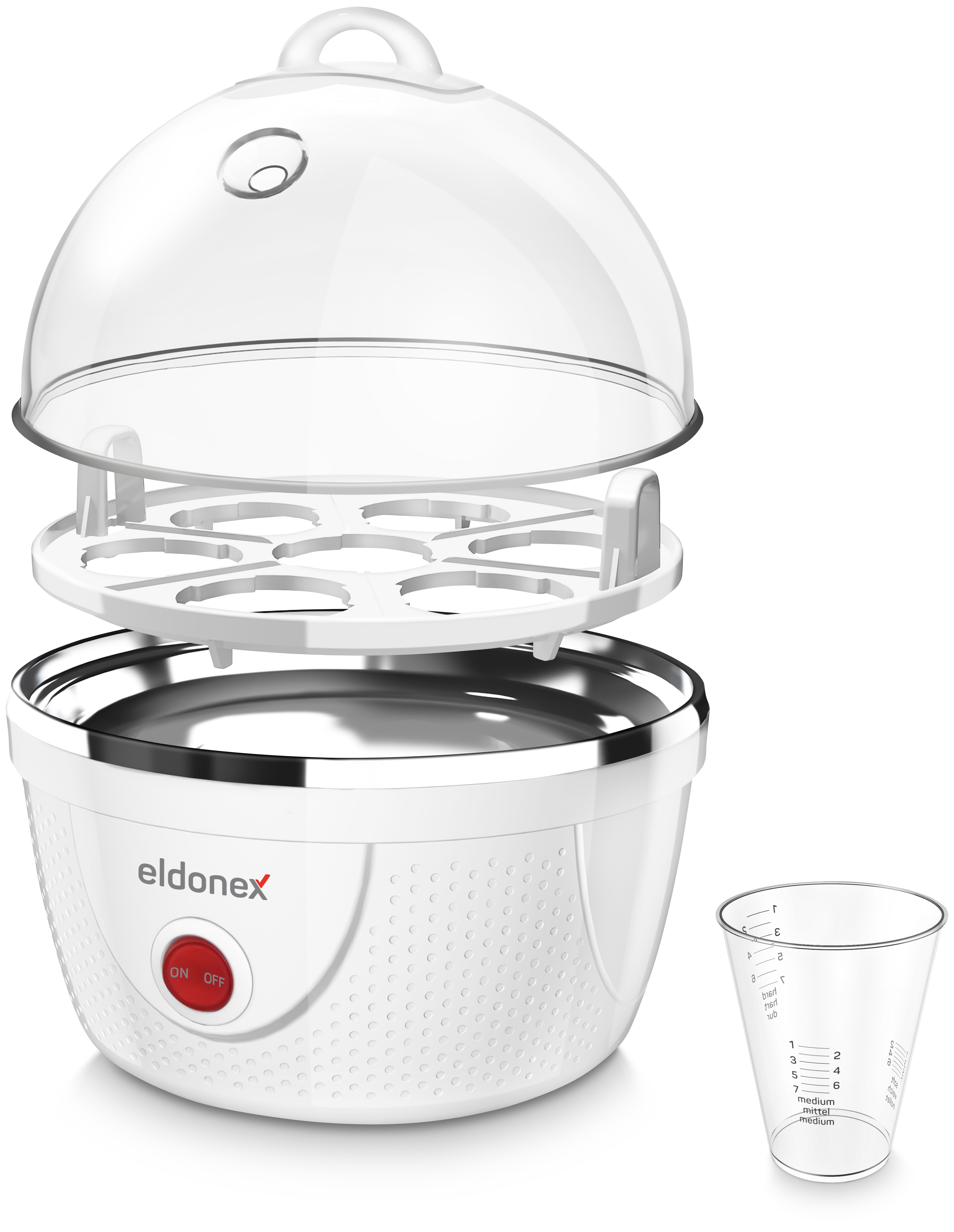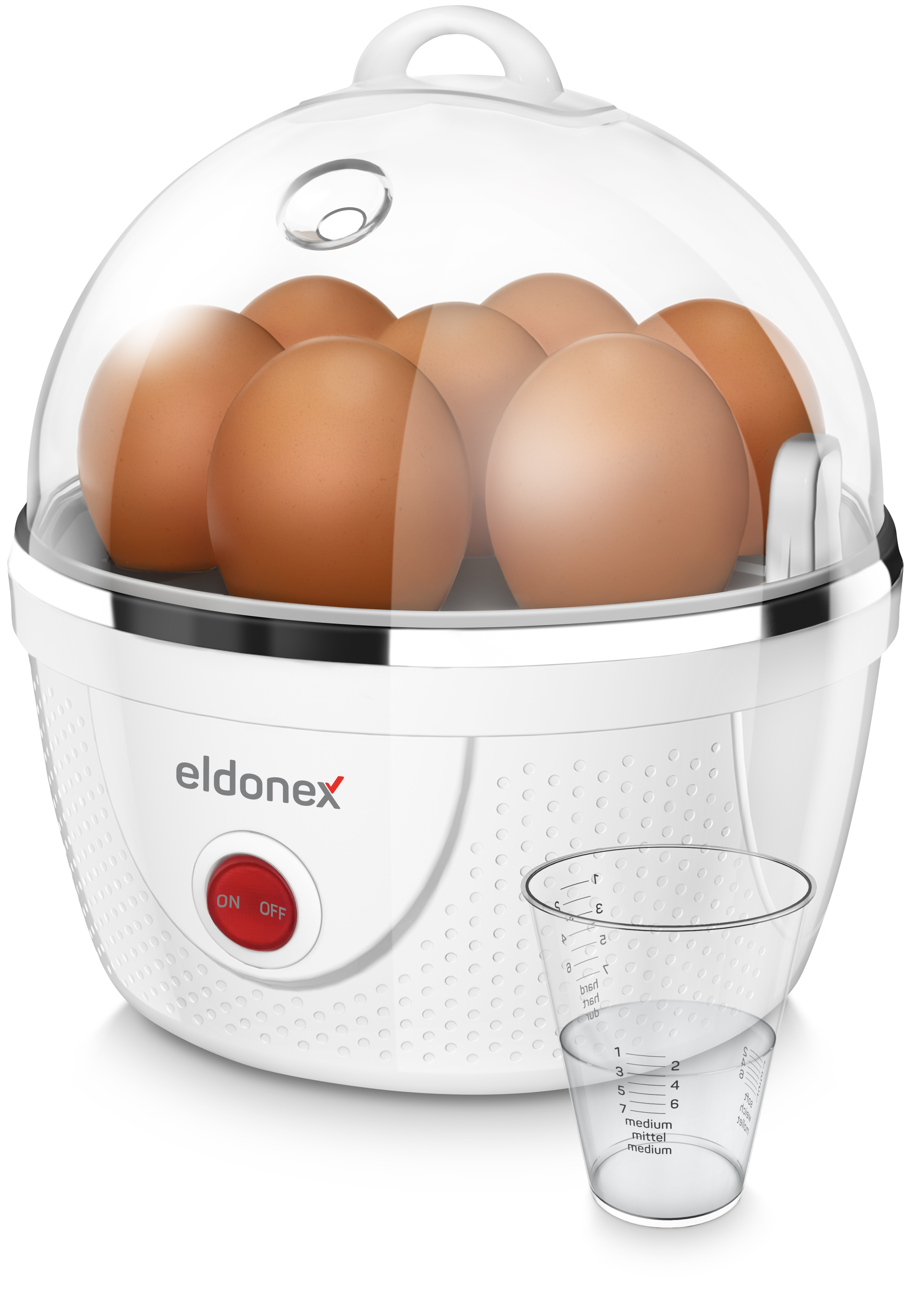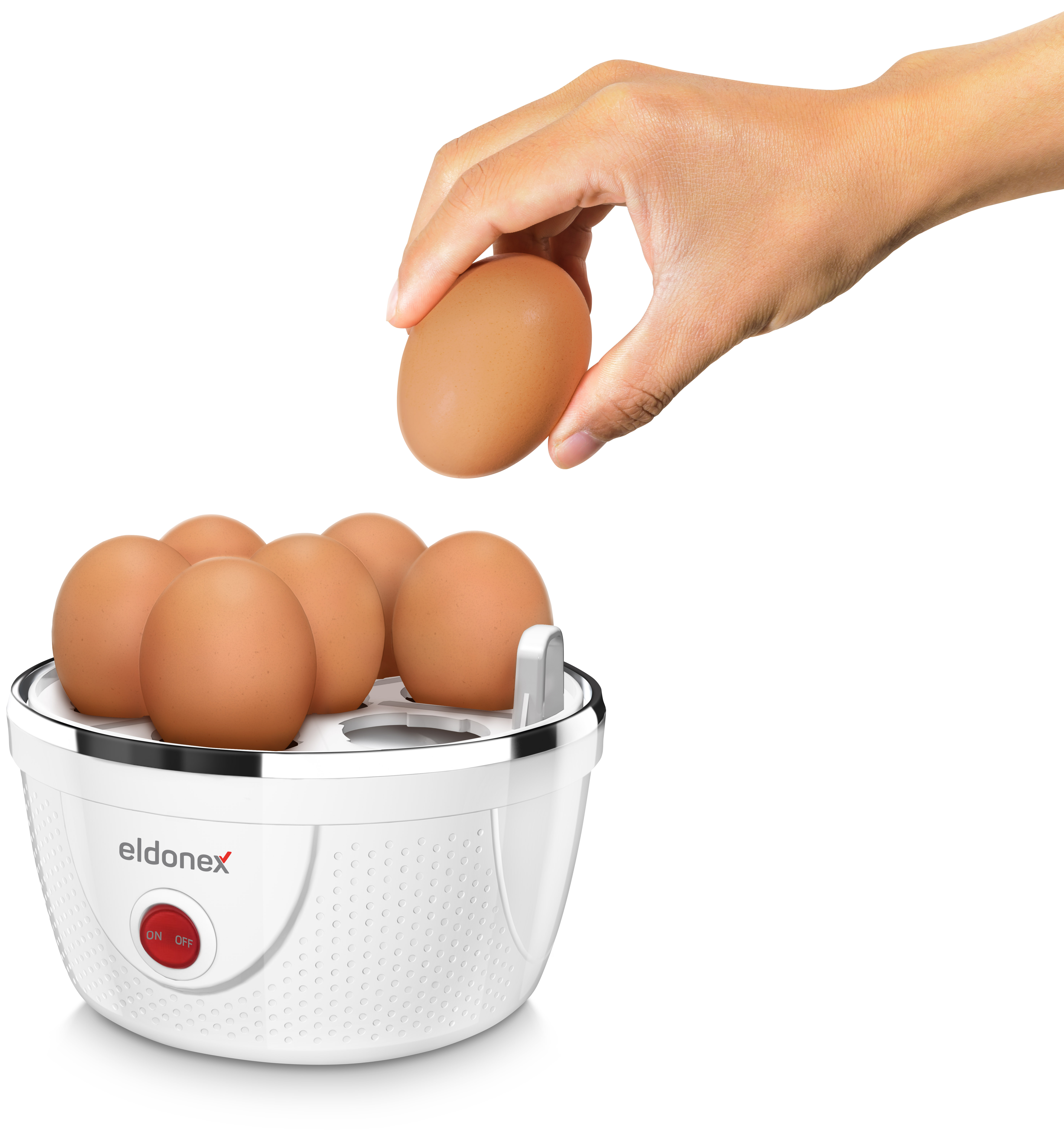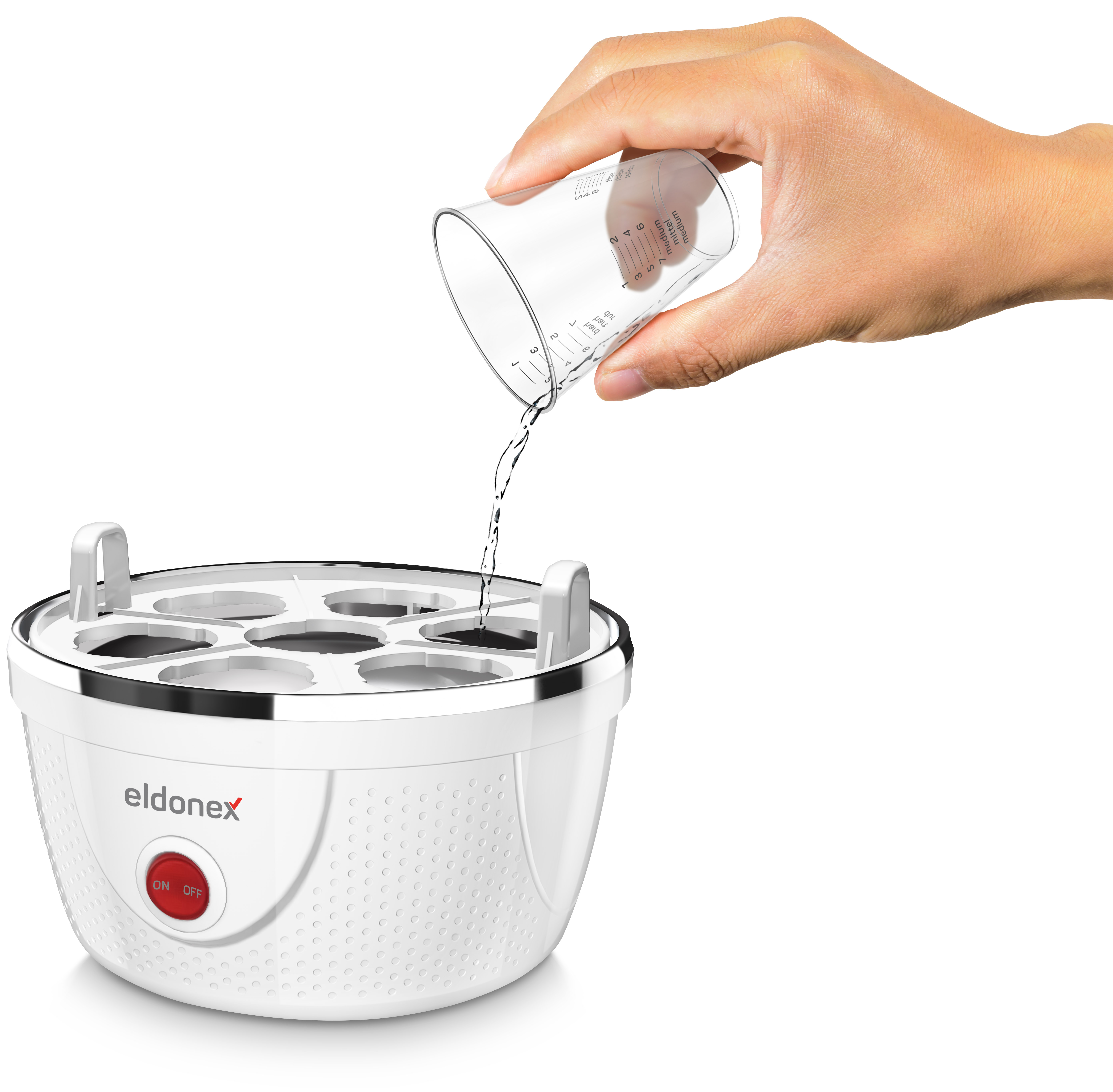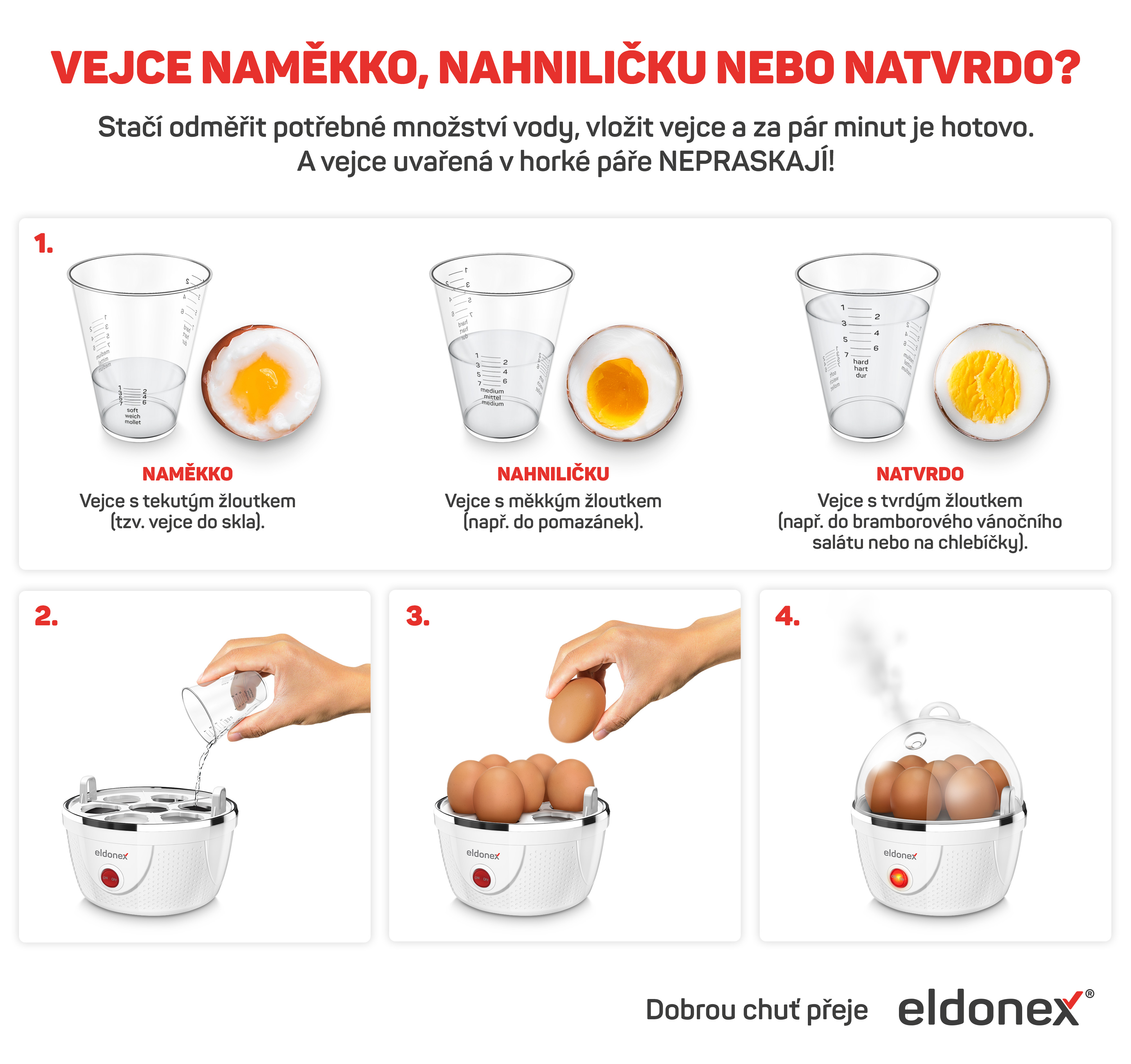 Stačí pouze vložit vejce, odměřit množství vody podle počtu vajec a jejich požadovaného stupně uvaření a zapnout vařič