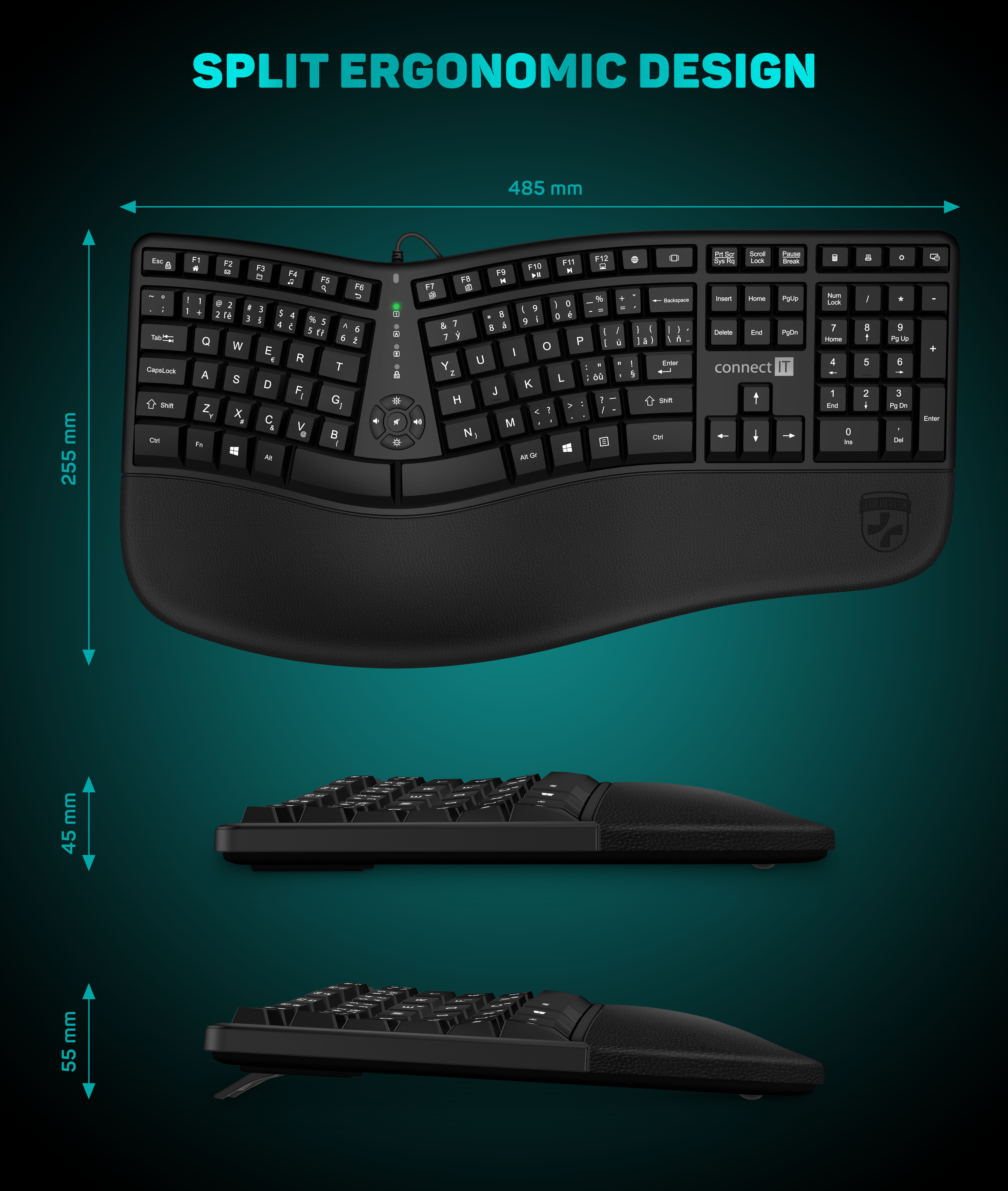 Ergonomická klávesnice určená speciálně jako prevence proti syndromu karpálního tunelu. Vhodná pro domácí použití i pro vysoko zátěžové profesionální použití v kancelářích a firmách. CZ+SK lokalizace (české a slovenské znaky).
