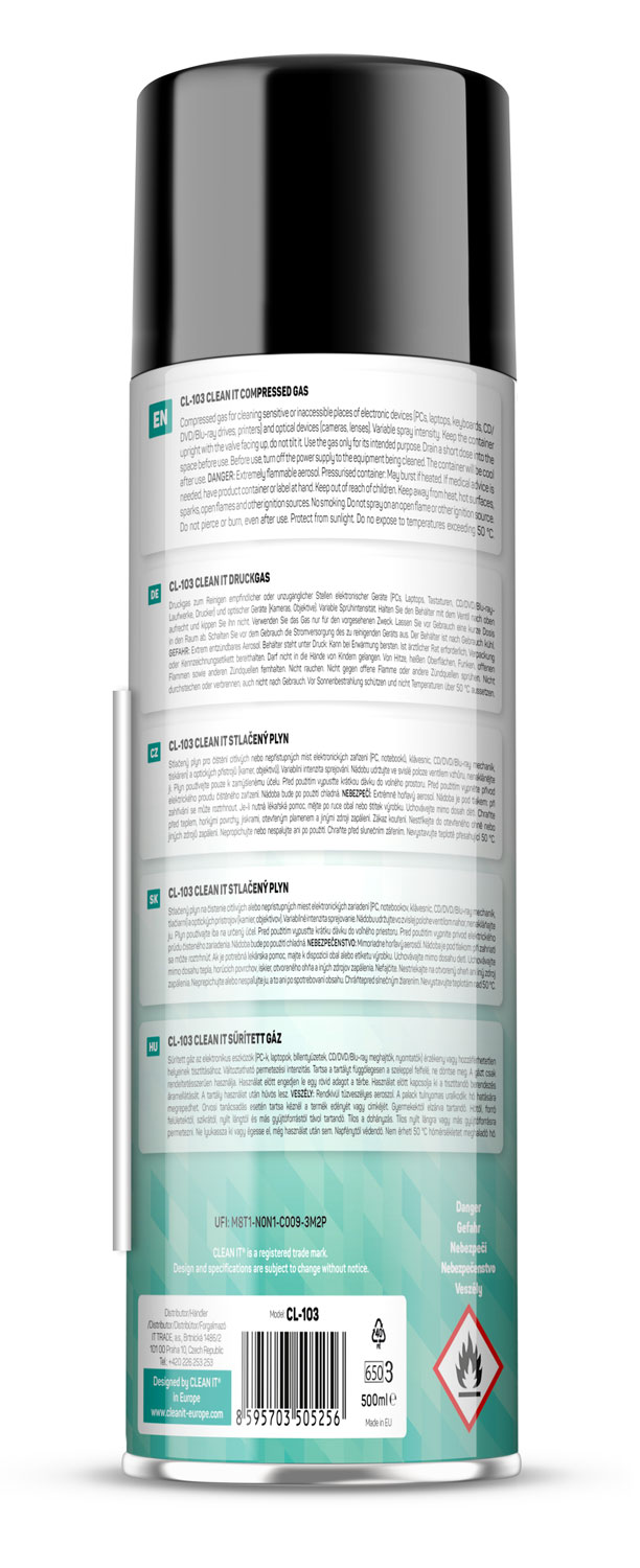 Stlačený plyn pro čištění (vyfoukávání) citlivých nebo nepřístupných míst elektronických zařízení (PC, notebooků, klávesnic, CD/DVD/Blu-ray mechanik, tiskáren atd.) a optických přístrojů (kamer, objektivů).