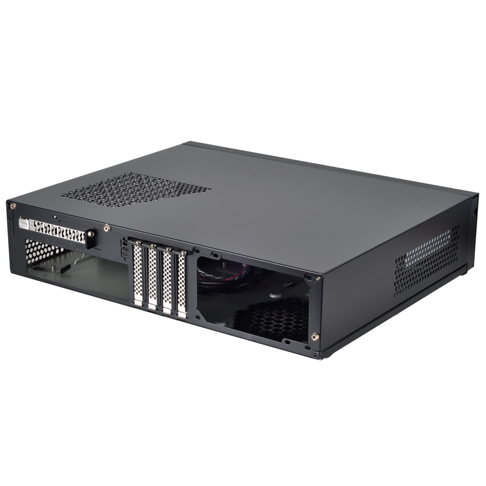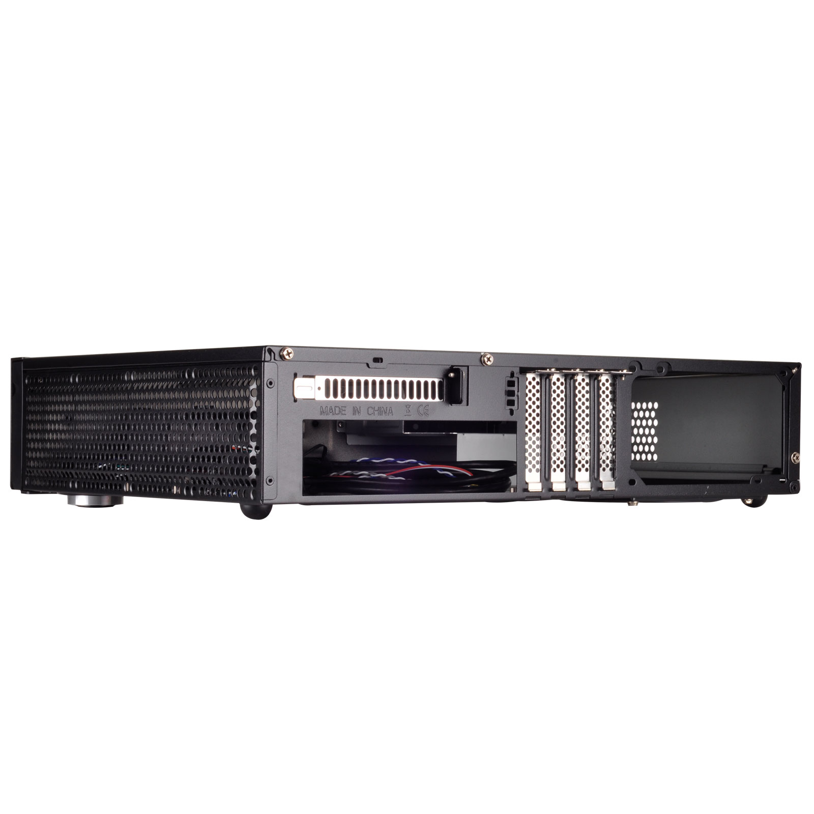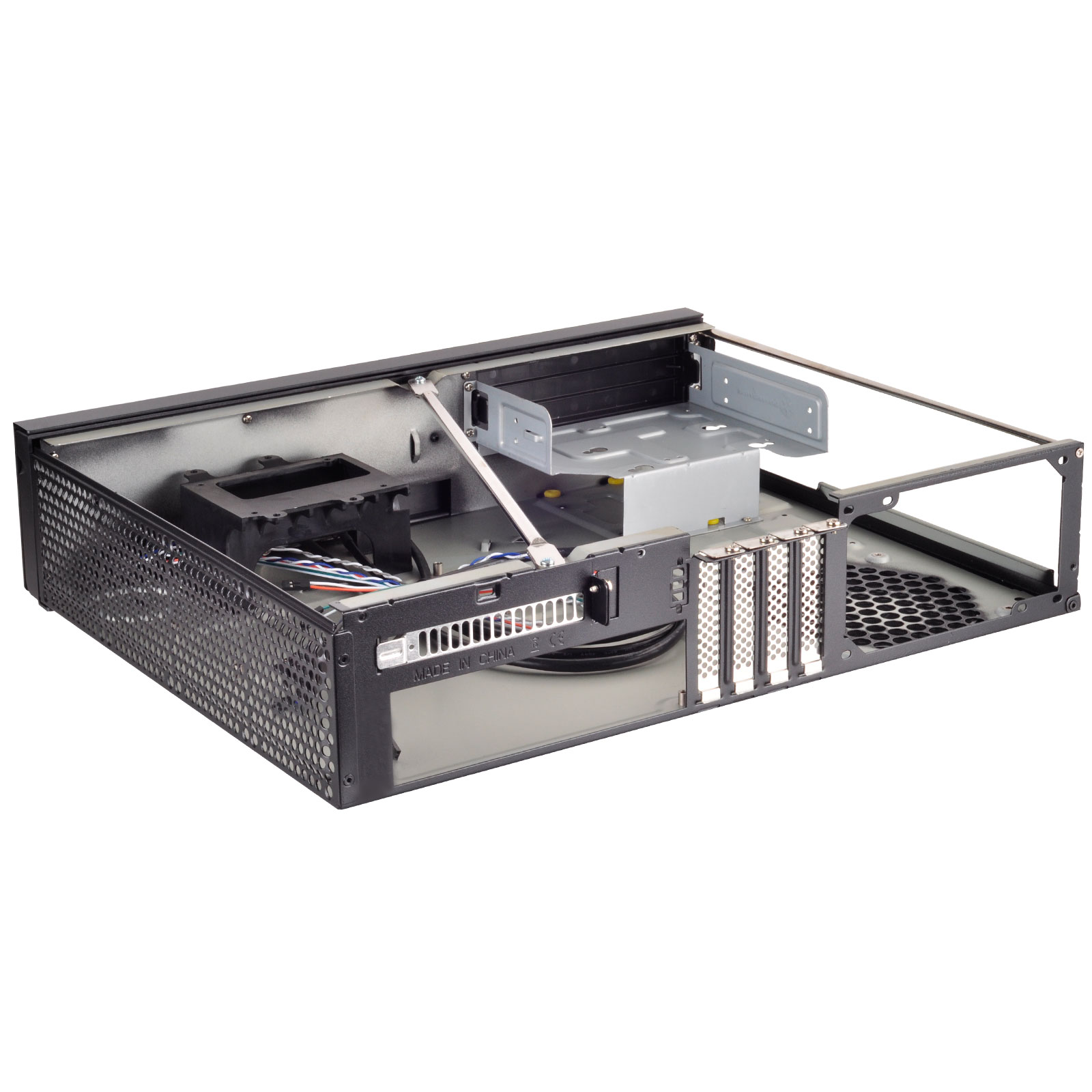 Počítačová skříň pro HTPC systémy, podpora Micro-ATX, Mini-DTX, Mini-ITX základních desek, 1x 5.25", 2x 3.5", 1x 2.5", 2x USB 3.0, 4x 80mm slot na ventilátor, 440x105x350mm, 4kg, bez zdroje, černá