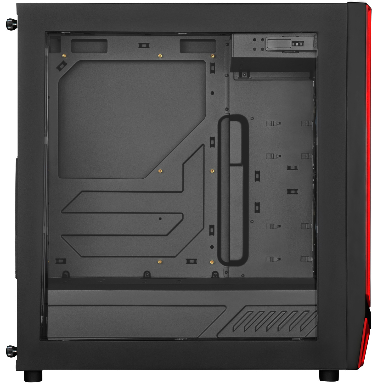 Počítačová skříň Mini Tower, podpora ATX, Micro-ATX základních desek, 1x 5.25", 2x 2.5"/3.5" HDD, 2x 2.5", USB 3.0 Type-A 2x, Type-C 1x, 2x 140mm ventilátor, 210x465x450mm, 5.9kg, bez zdroje, černo-červená