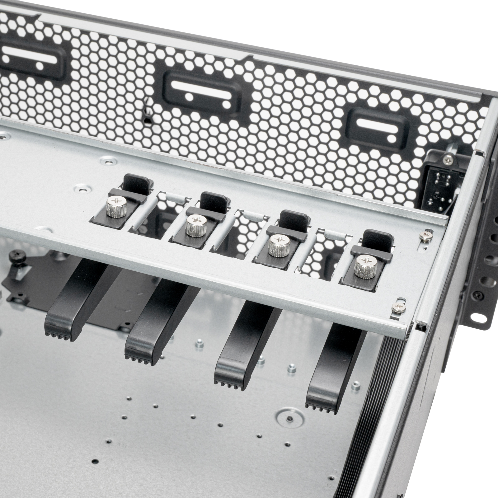 - Ochrana rozšiřujících karet: Expansion card retainer bezpečně fixuje grafické karty, zabraňuje prohnutí a poškození a optimalizuje interní prostor.