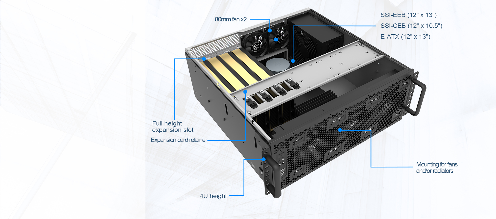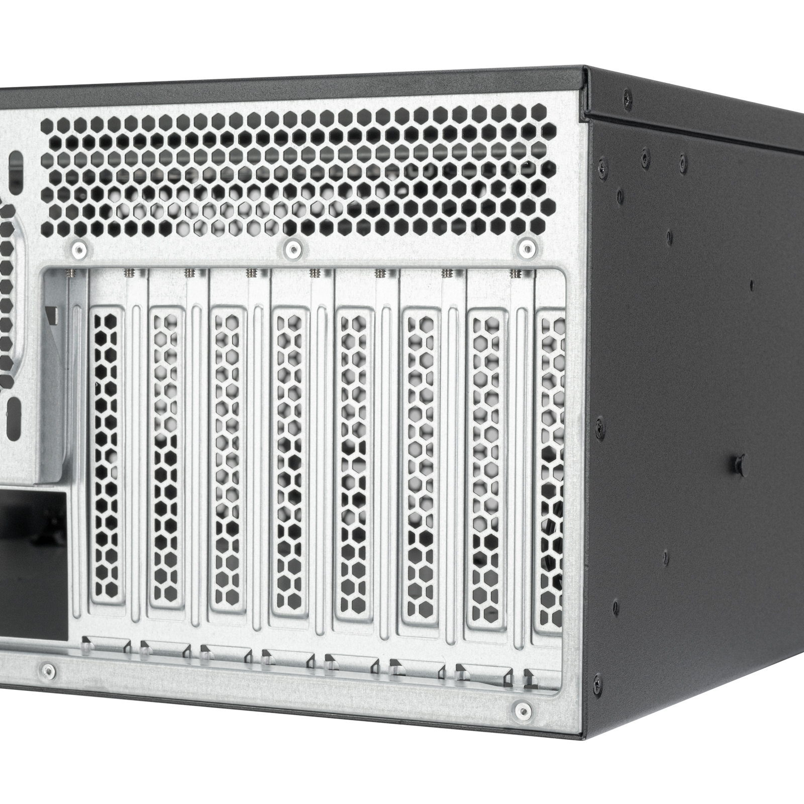 - Rozšiřitelnost PCI: 8 slotů, délka karet až 424 mm (bez předních ventilátorů a radiátorů), šířka 113-154 mm dle přítomnosti retaineru.