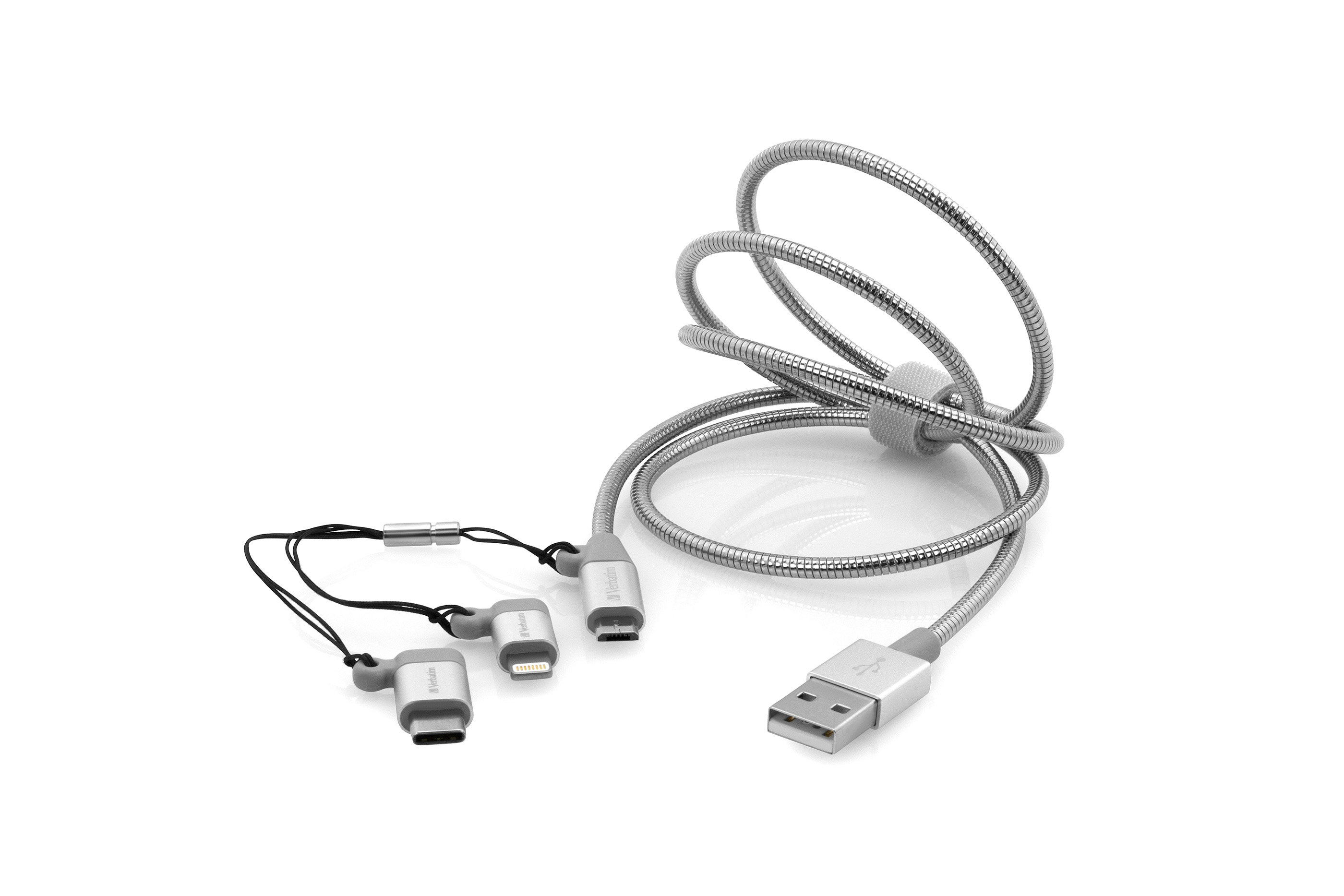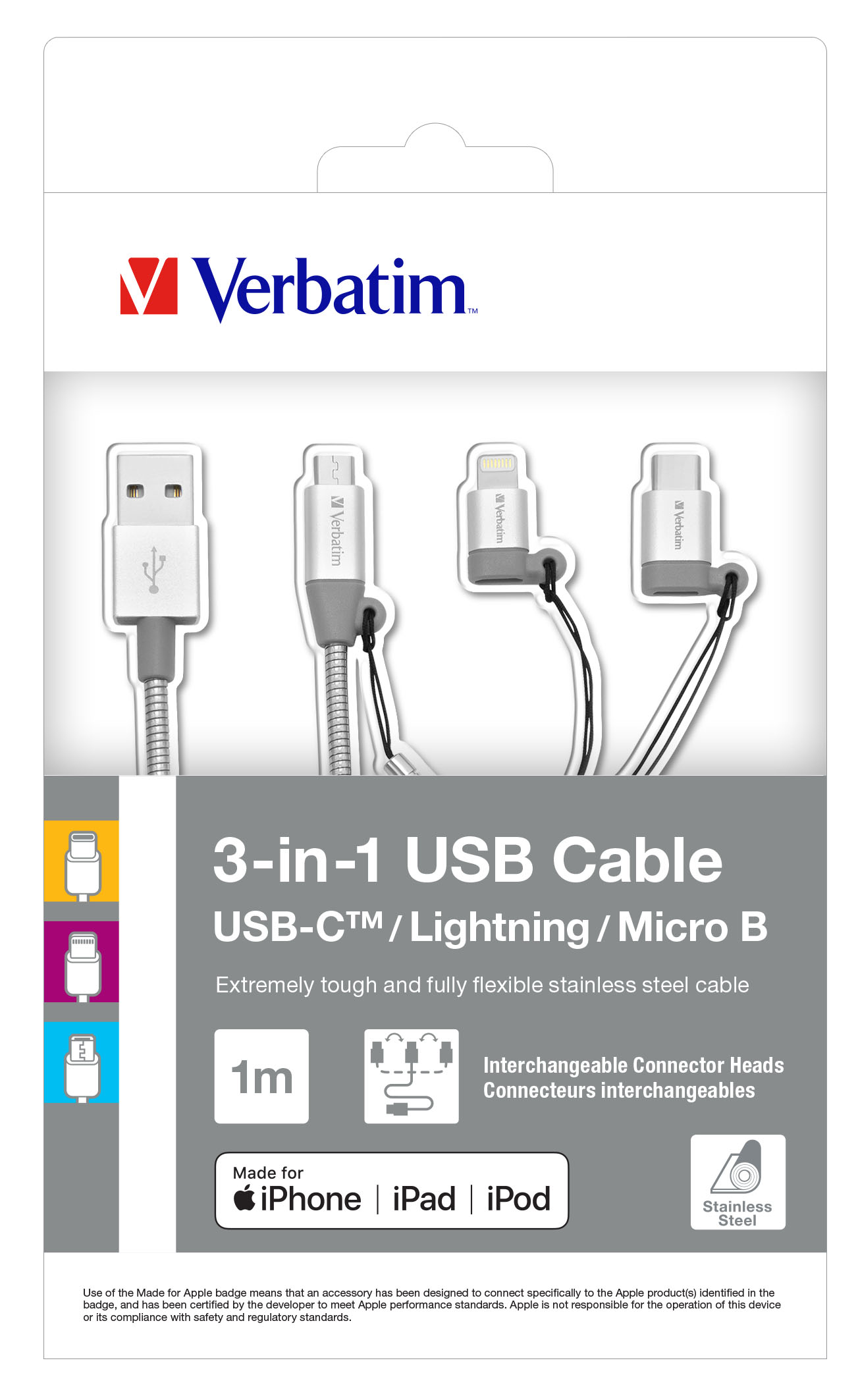 VERBATIM 3-IN-1 USB-C™ / LIGHTNING / MICRO B STAINLESS STEEL SYNC & CHARGE CABLE 100CM SILVER