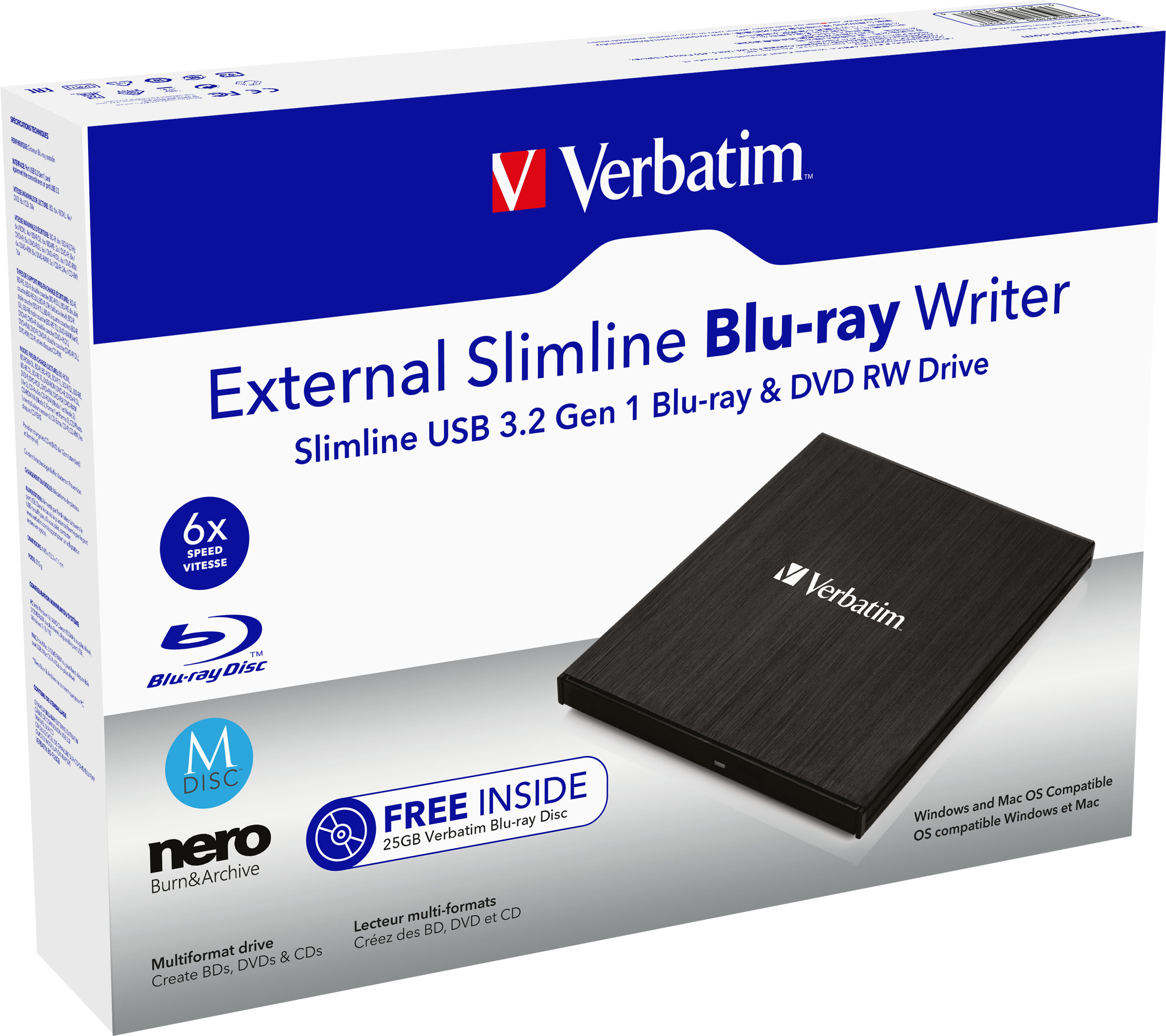 Blu-ray disky se rychle dostávají do povědomí jako nejlepší produkty pro archivaci cenných dat, a to díky jejich formátu použitelnému i v budoucnosti, široké kompatibilitě, vysoké kapacitě a velmi dlouhé životnosti ve srovnání s pevnými disky a magnetickými páskami. Čím dál více výrobců notebooků bohužel vynechává optickou jednotku, aby se jejich modely mohly pochlubit svou tenkou konstrukcí. Verbatim nabízí řešení v podobě externí Blu-ray Slimline vypalovačky.