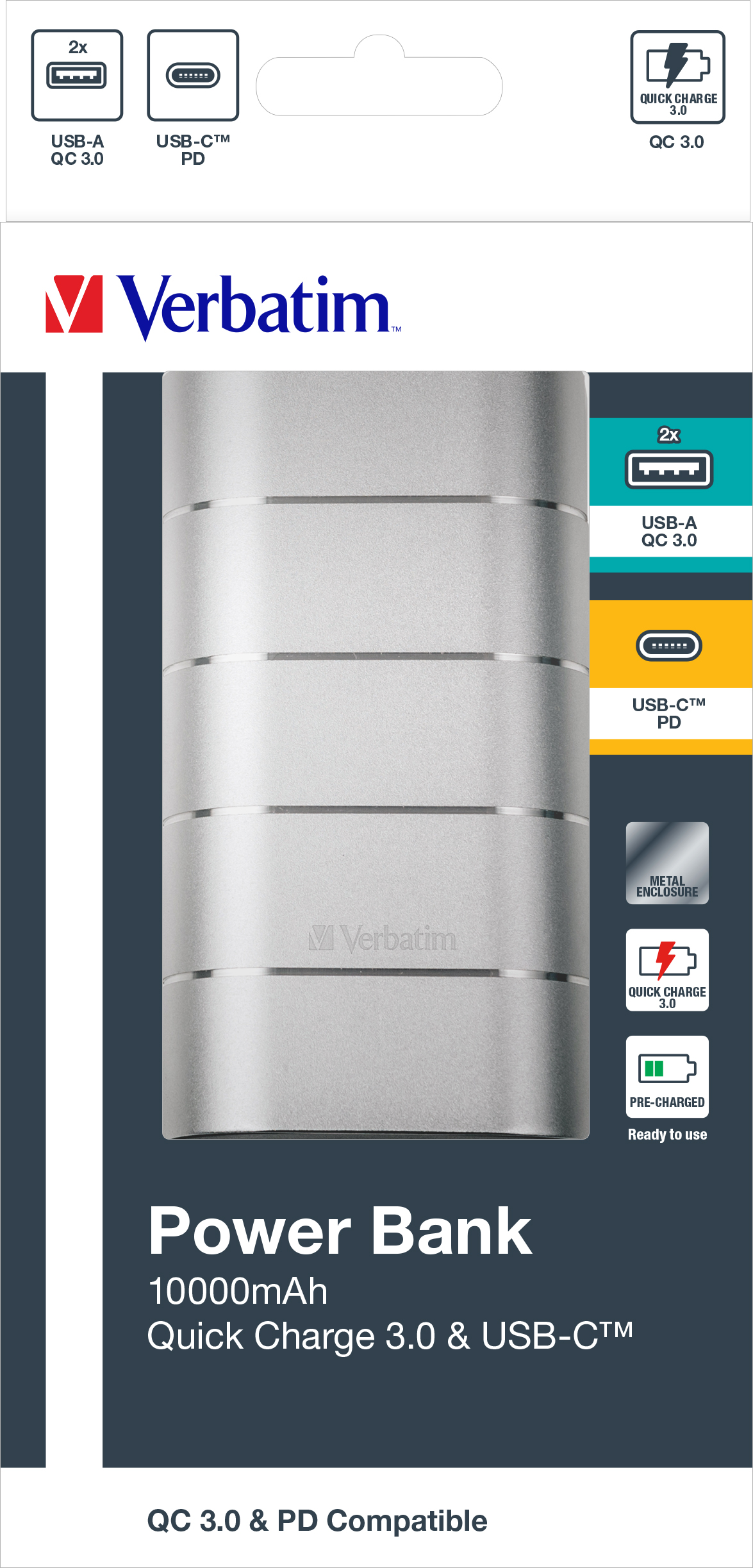 VERBATIM POWERBANK 10000mAh GREY/SILVER METAL QC3 & USB-C