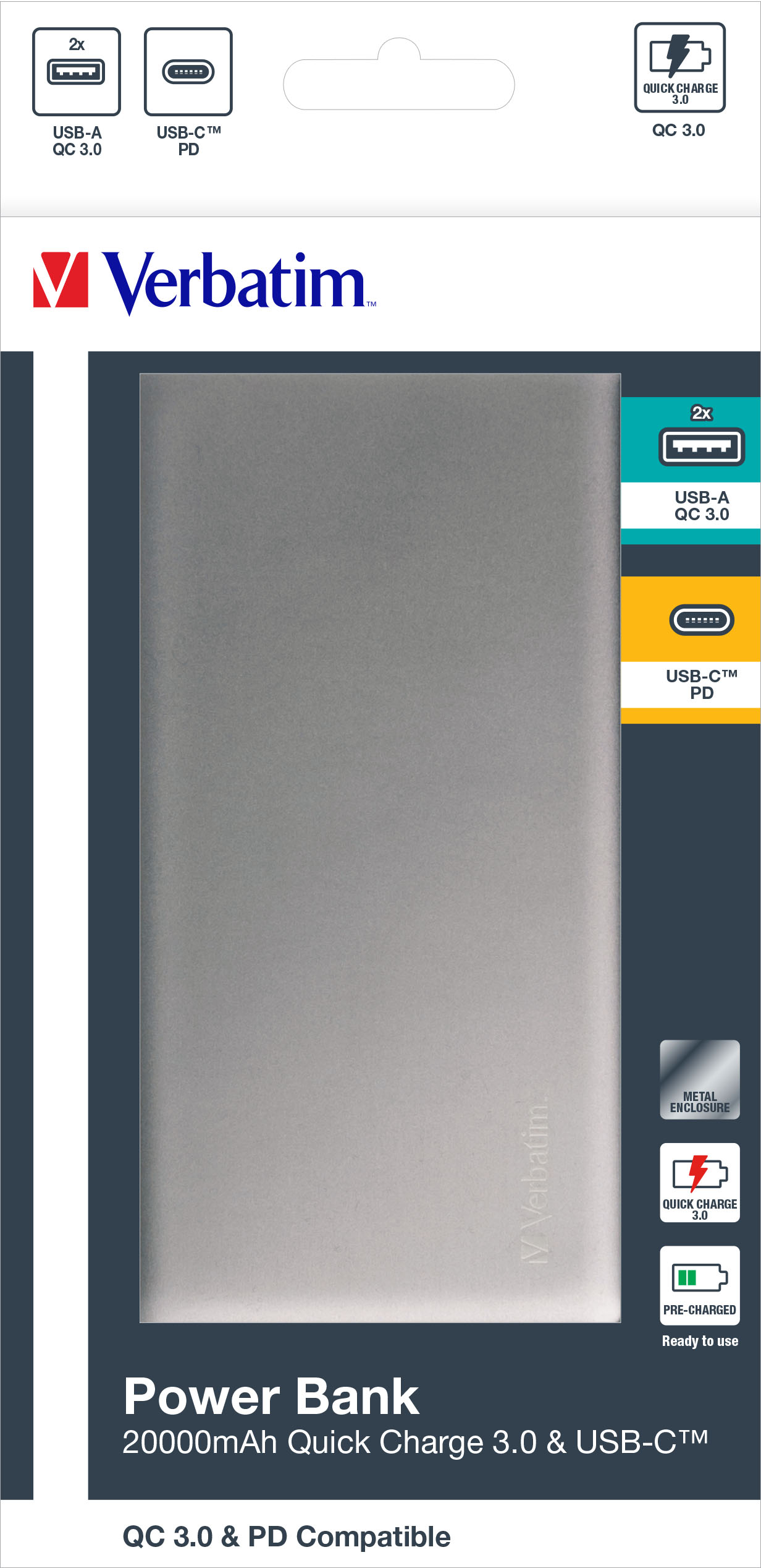 VERBATIM POWERBANK 20000mAh SILVER METAL QC3 & USB-C