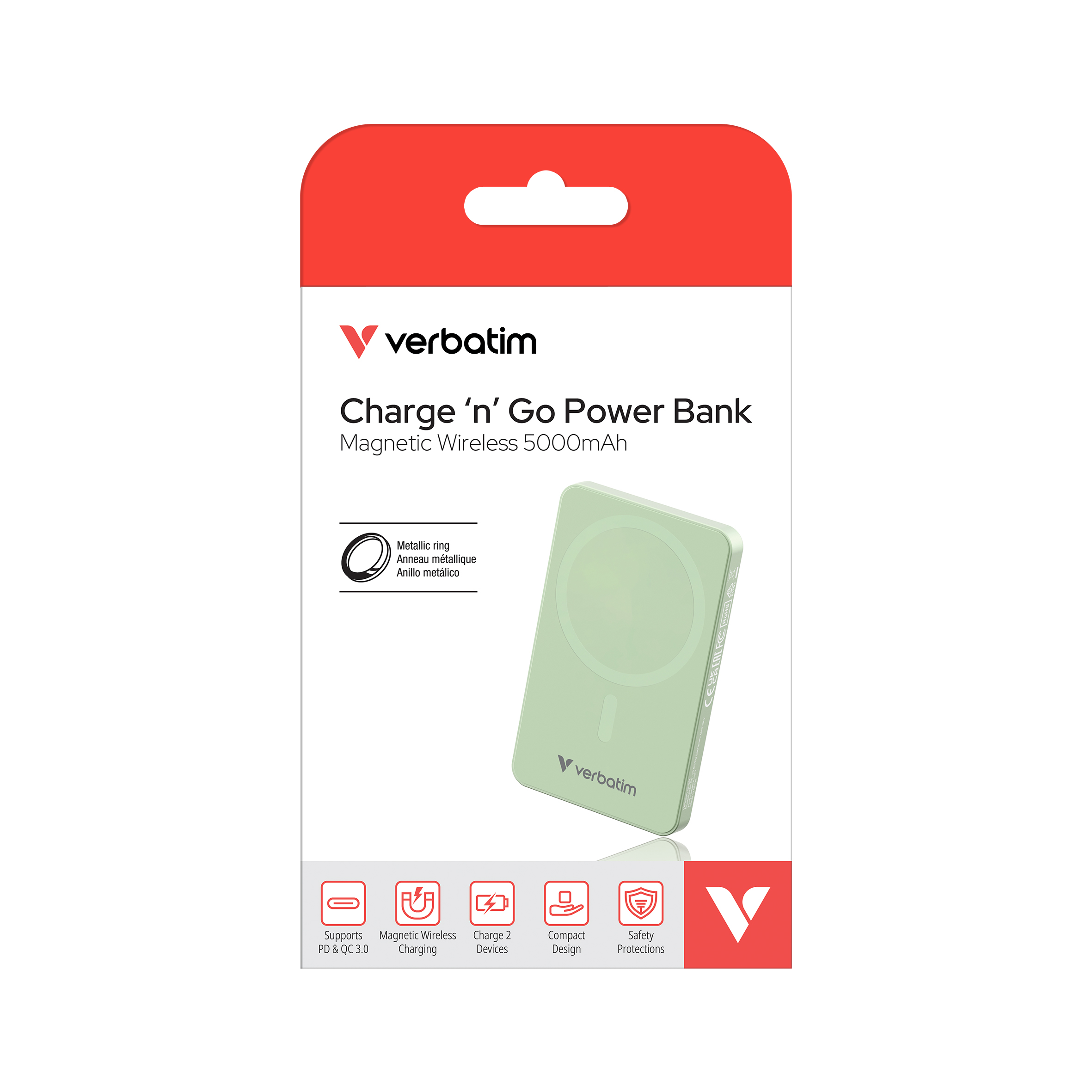 VERBATIM POWERBANKA 5000 mAh - Charge ´n´ Go Essentials, bezdrátová/MagSafe, USB-C , zelená