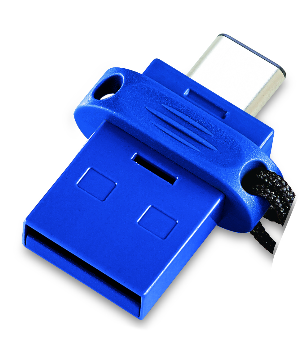 Flash disk USB 3.0, USB-C, rychlost čtení až 110 MB/s, rychlost zápisu až 20 MB/s, poutko na klíče, černo-modrá