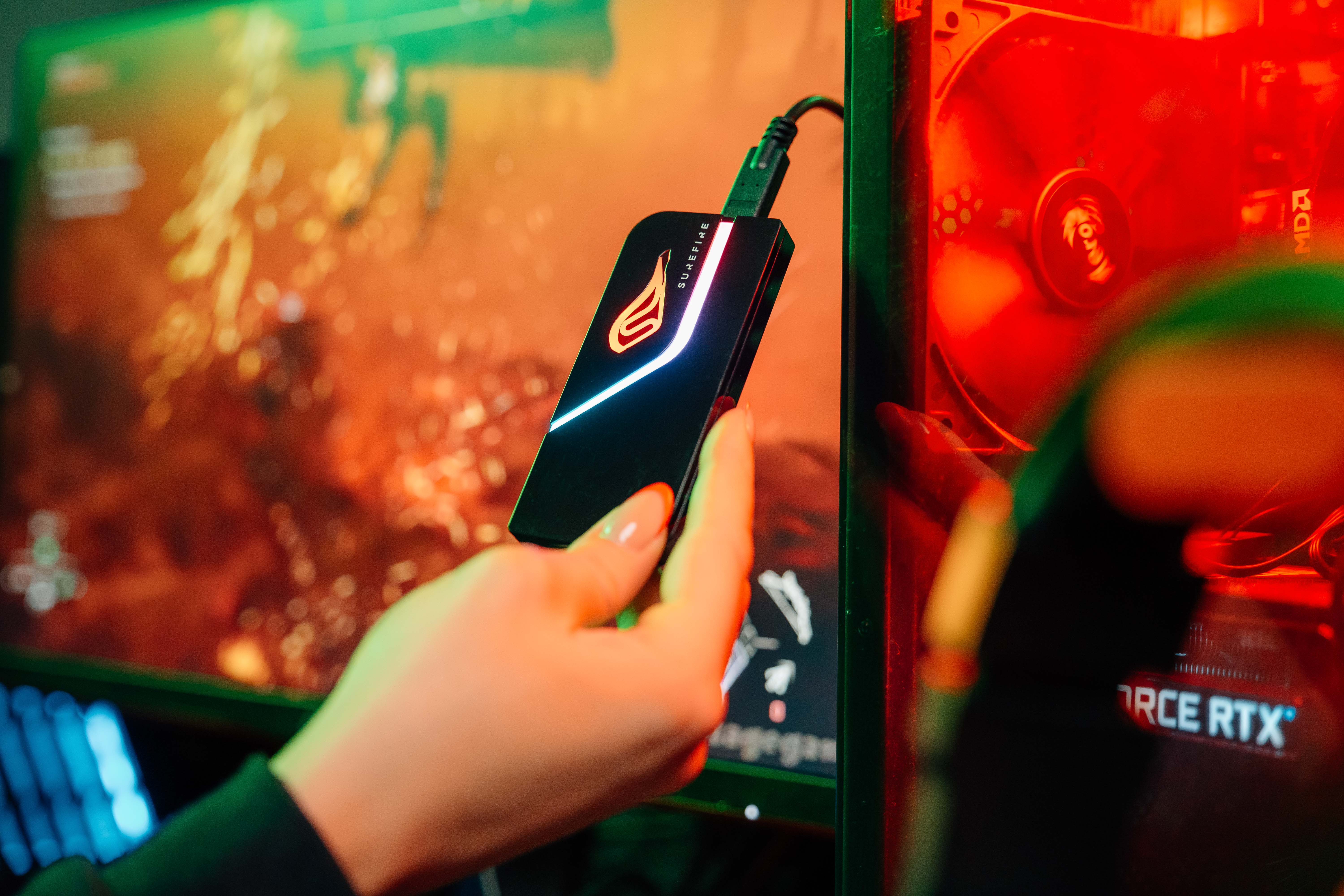 Herní konzole, notebooky a PC mají omezenou kapacitu úložiště a nejnovější hry ji velmi rychle zaplní. Řešením je SureFire PyroDrive Gaming SSD Slim - externí SSD disk s velkou kapacitou (1 TB / 2 TB) navržený speciálně pro hráče, kteří chtějí pohodlně uchovávat svou herní knihovnu na jednom místě. Díky rychlému rozhraní USB 3.2 Gen 2 (10 Gbps) dosahuje rychlosti čtení a zápisu až 1 000 MB/s, což výrazně zrychluje načítání her.
