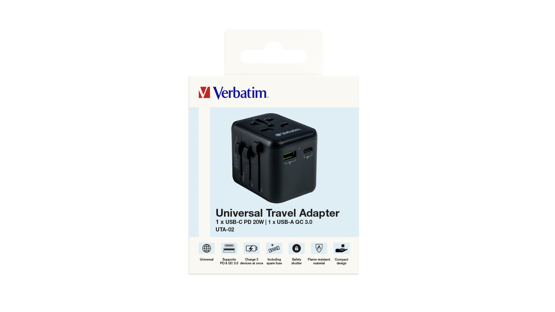 VERBATIM UTA-02 Universal Travel Adapter with 1 x USB-C PD 20W / 1 x USB-A QC 3.0