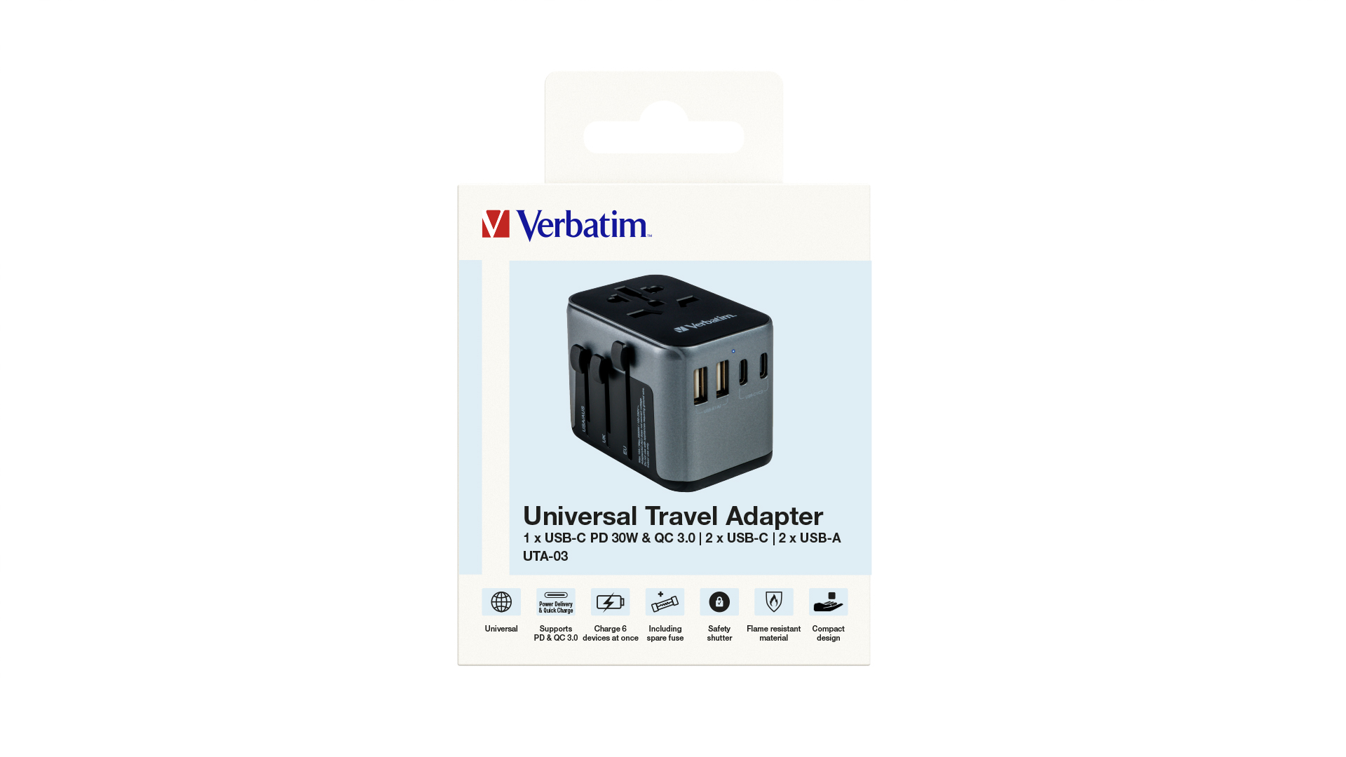 VERBATIM UTA-03 Universal Travel Adapter with 1 x USB-C PD 30W & QC 3.0 / 2 x USB-C / 2 x USB-A