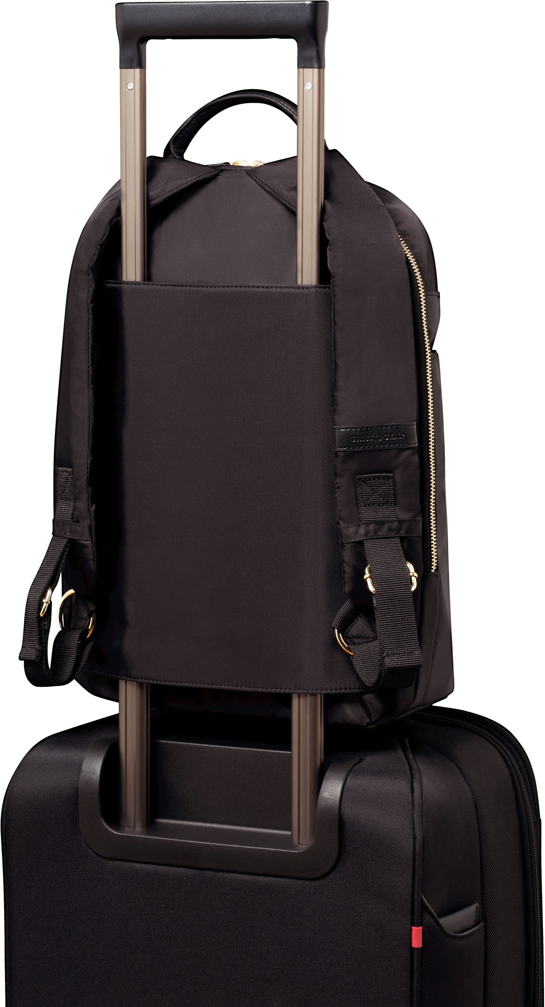 - po rozepnutí zadní kapsy vznikne úchyt pro zasunutí rukojeti zavazadel s kolečky pro snadné a konsolidované cestování