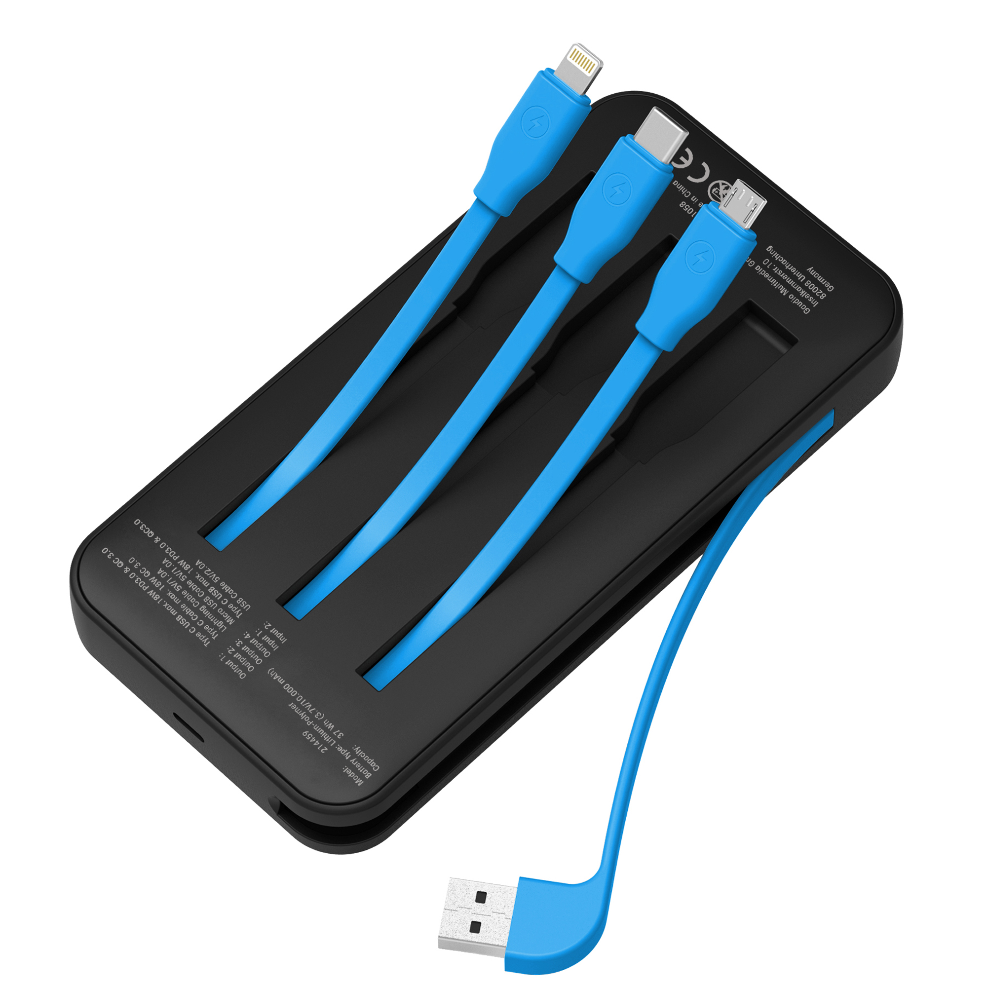 - Vestavěný Lightning, USB-C a Micro-USB kabel